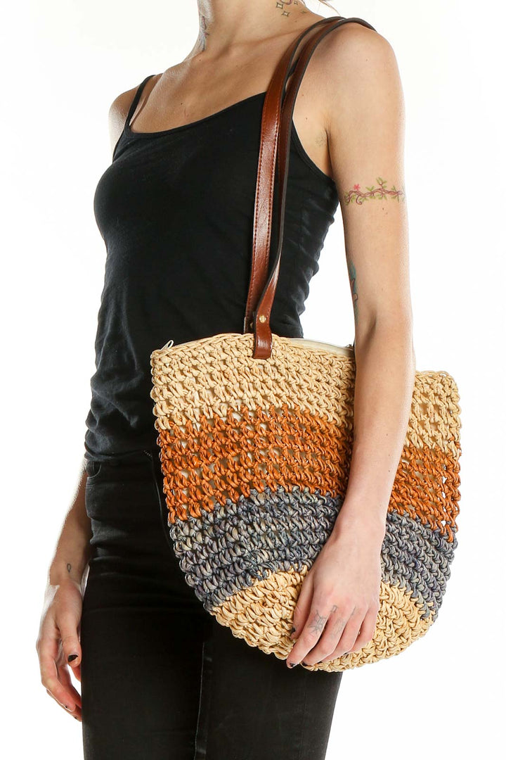 Elevate your summer style with this charming multicolor striped straw tote bag by Bruno Lorelli. Perfect for beach days or casual outings, this bag combines fashion and functionality. The woven straw construction features a delightful color-block design in beige, orange, and gray, creating a visually appealing and versatile accessory.