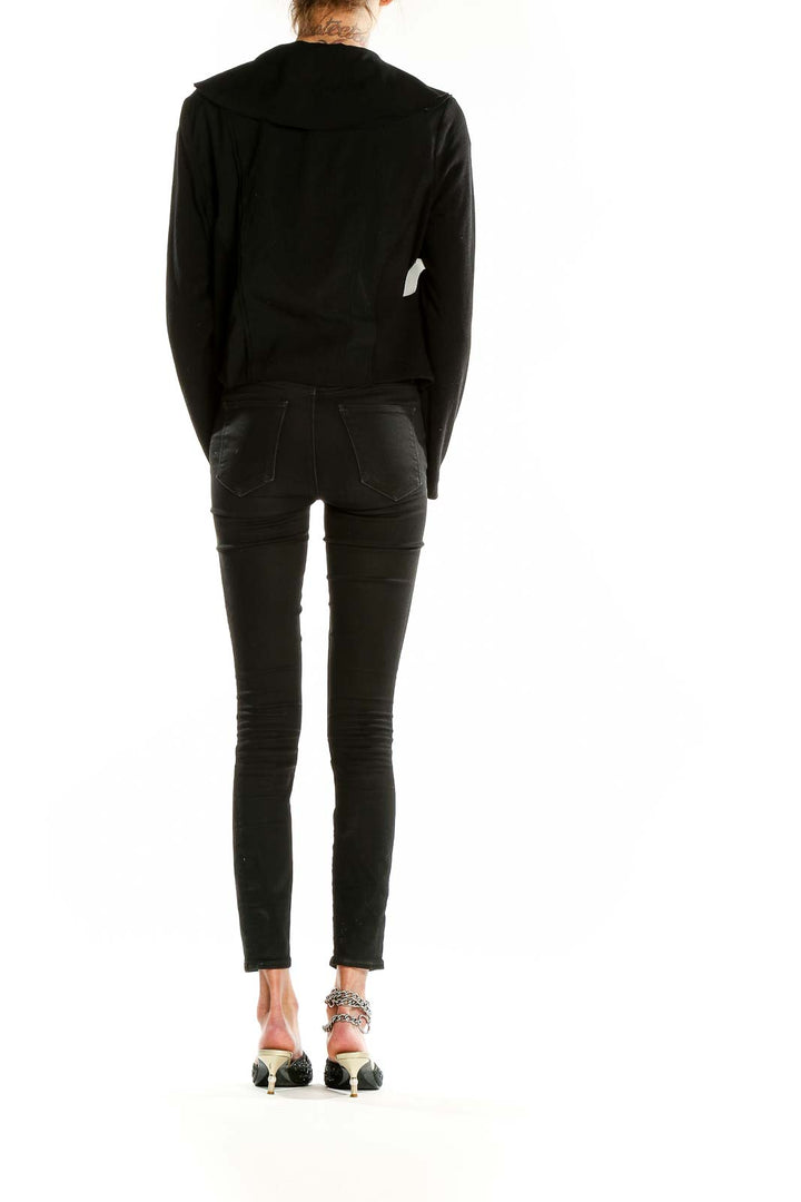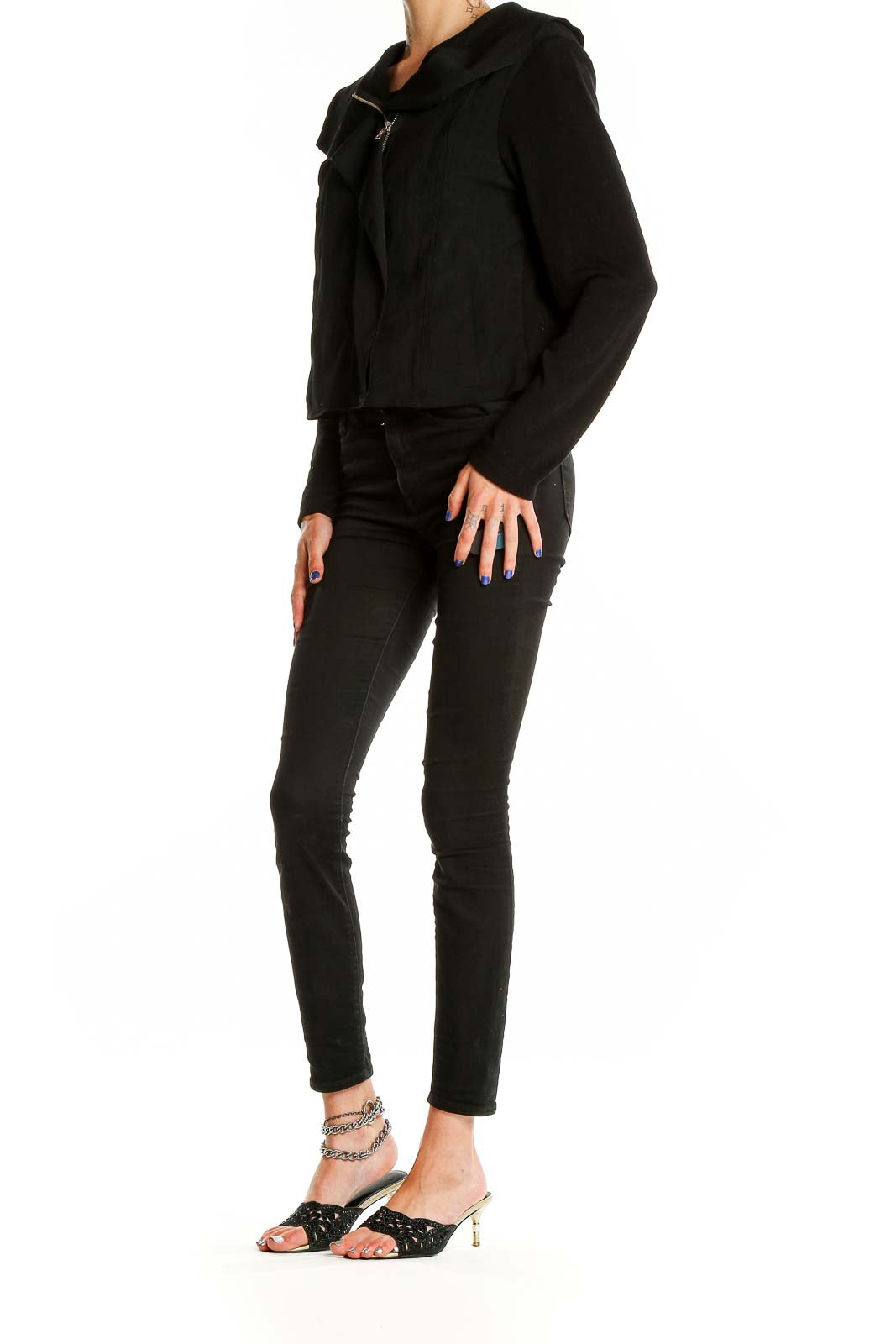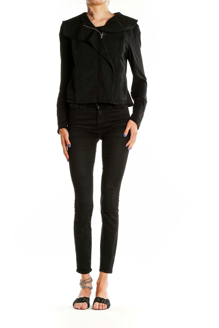 Pair this chic jacket with skinny jeans and ankle boots for a casual yet stylish ensemble, or dress it up with a sleek dress for a night out. The versatile black color ensures it will complement a wide range of outfits, making it a go-to piece for various occasions.