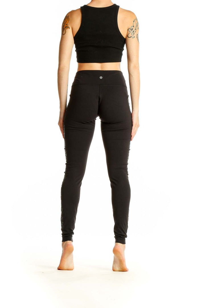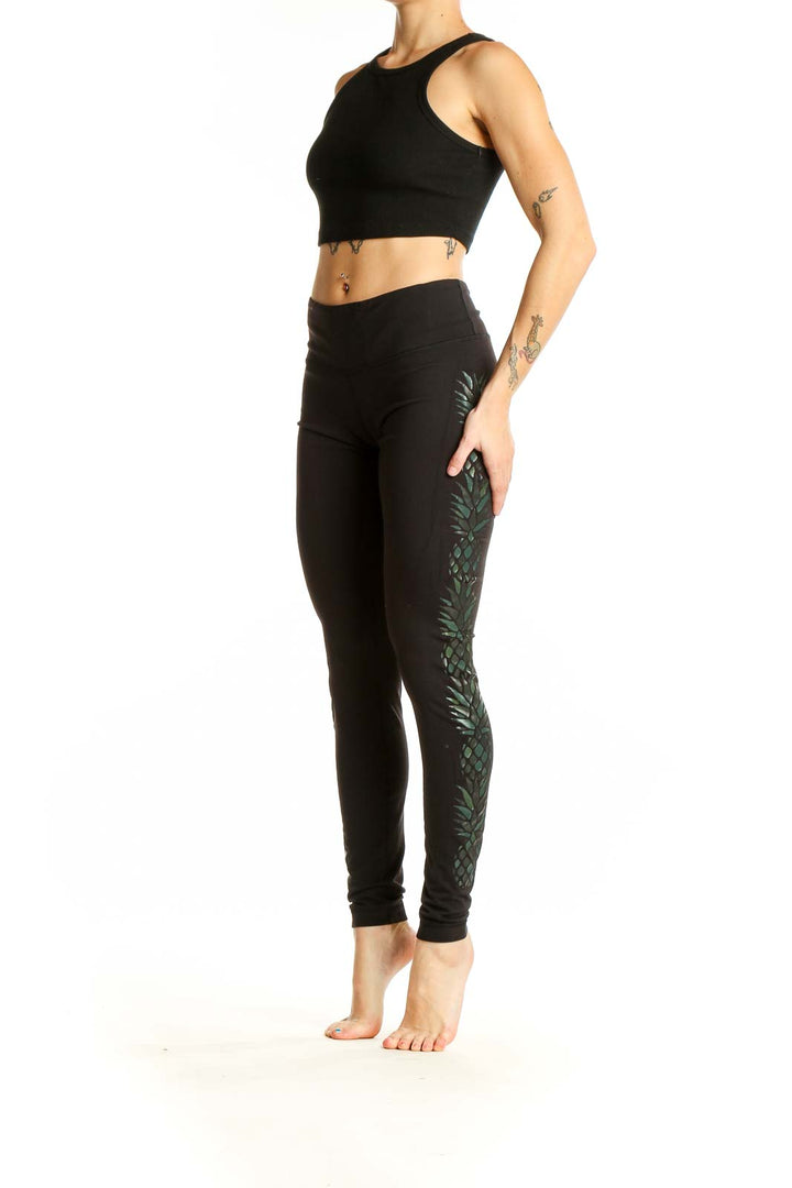 Elevate your workout wardrobe with these sleek black Lululemon activewear leggings. Featuring an eye-catching green leaf pattern along the sides, these leggings blend style with functionality. Crafted from a high-performance blend of Lycra and Nylon, they offer both comfort and durability for your most intense workouts.