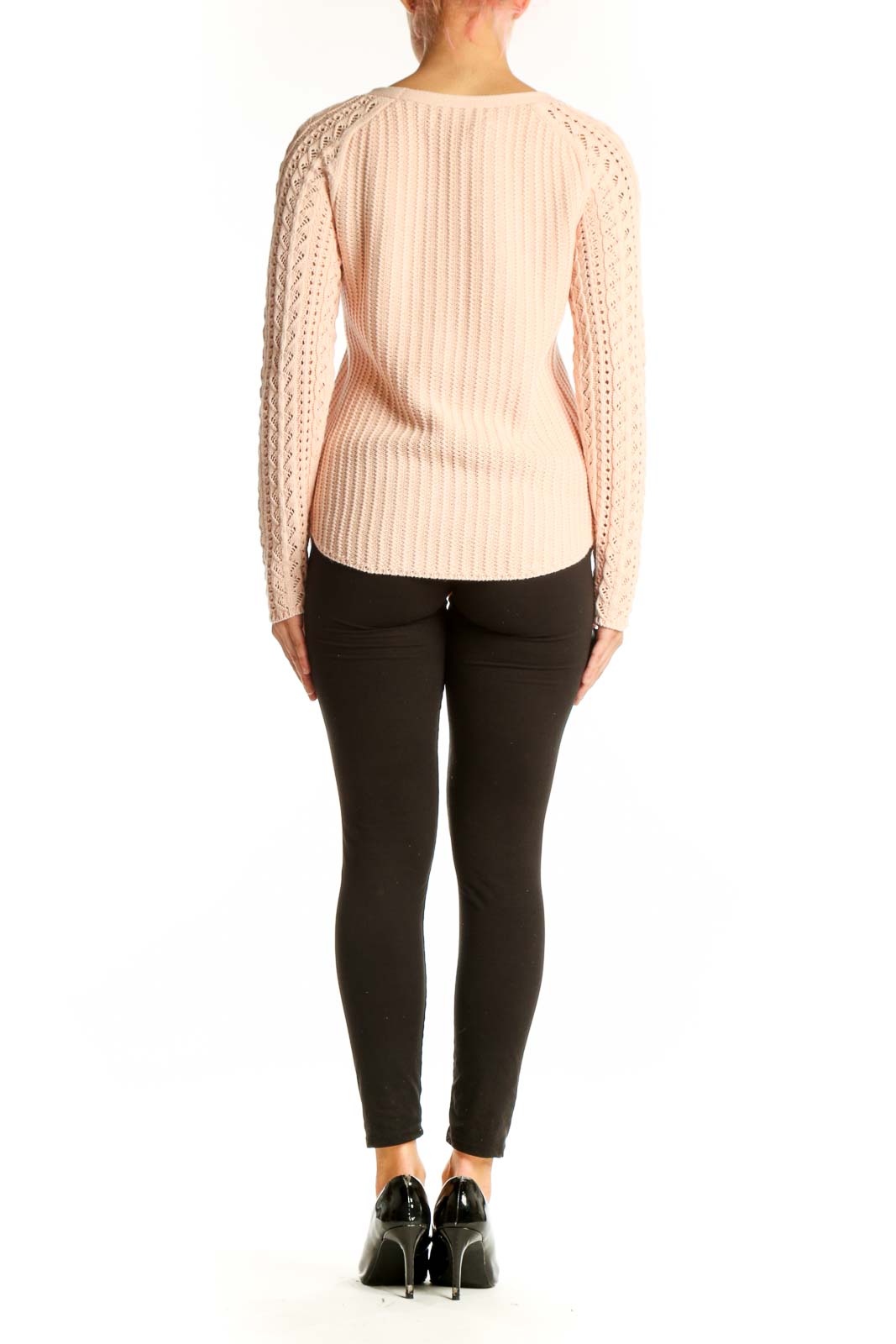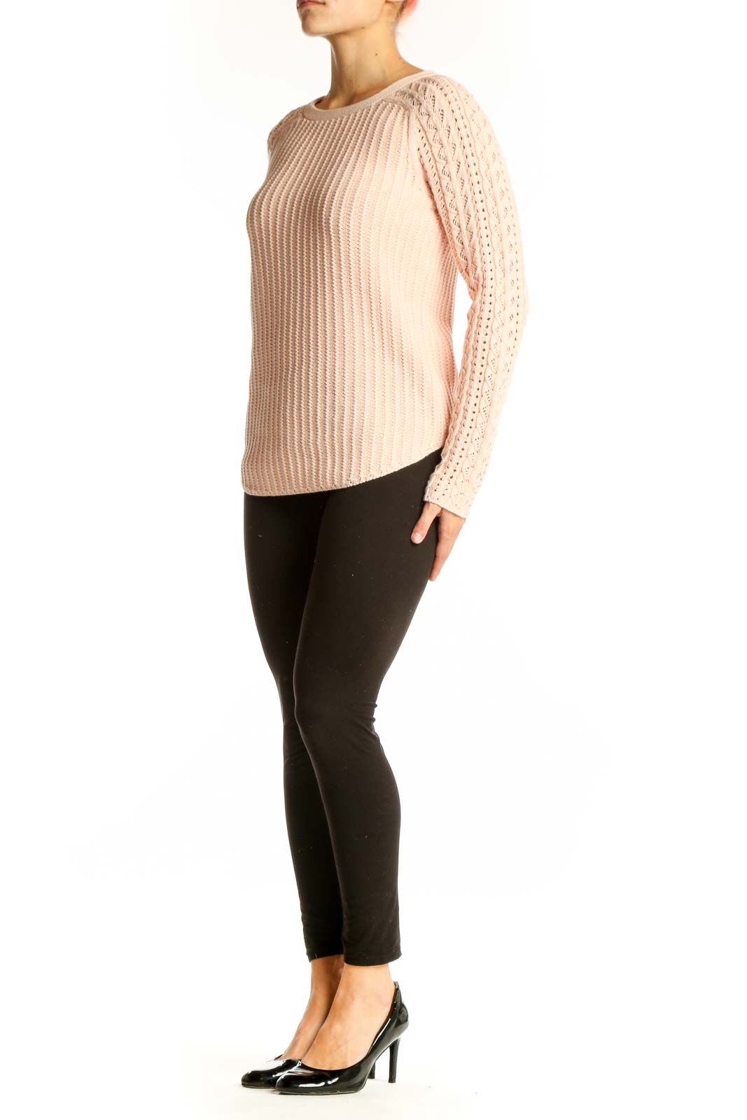 Elevate your casual wardrobe with this exquisite blush-toned ribbed sweater from LOFT. Crafted from soft, breathable cotton, this piece combines comfort with style. The body features a classic ribbed texture, while the sleeves showcase a delicate lace pattern, adding a touch of femininity and elegance to the overall design. The round neckline and relaxed fit make it versatile for various occasions.