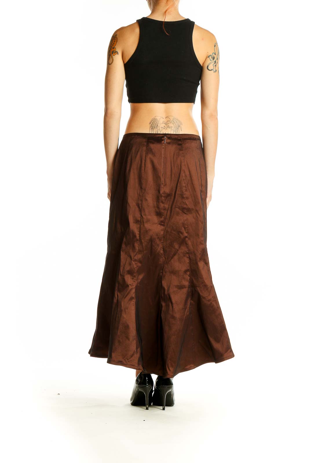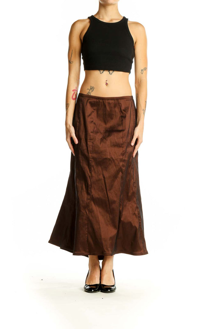 The rich chocolate brown hue adds a touch of sophistication, making it perfect for formal events or upscale dinners. The skirt features a fitted waist and hips, flaring out gracefully towards the hem for a flattering fit. With its floor-length design and subtle sheen, this piece exudes timeless glamour.