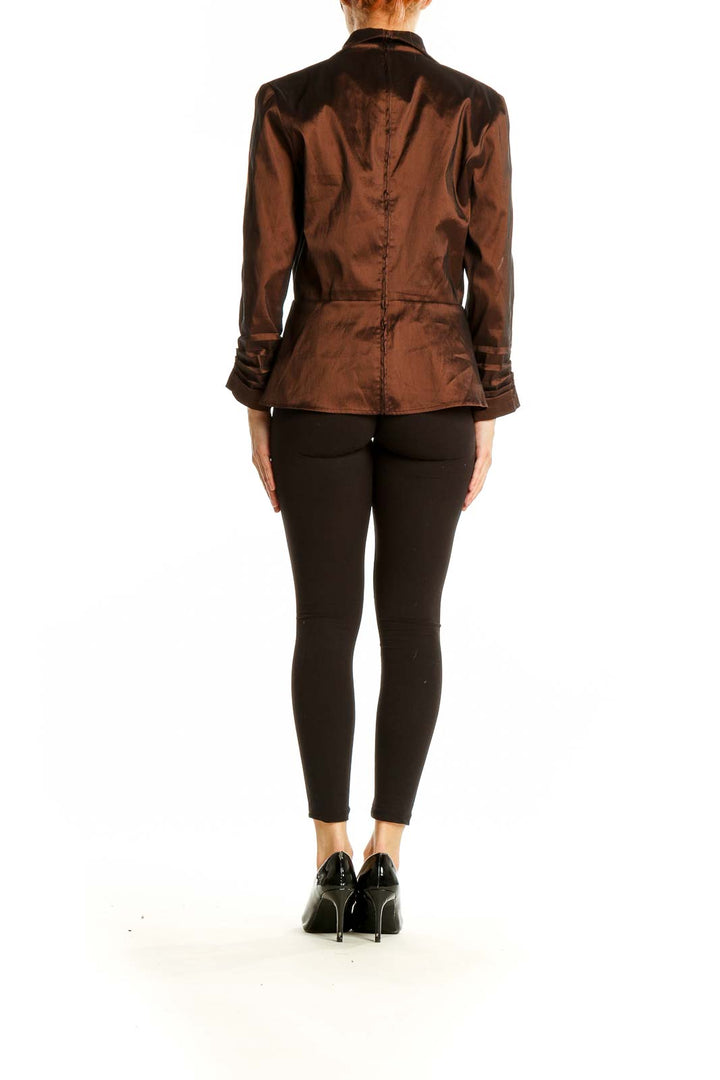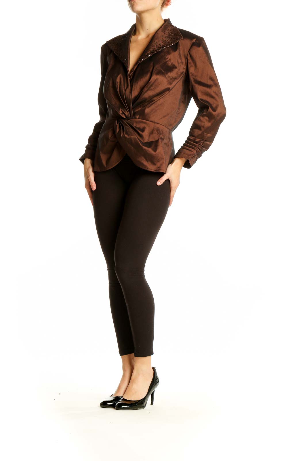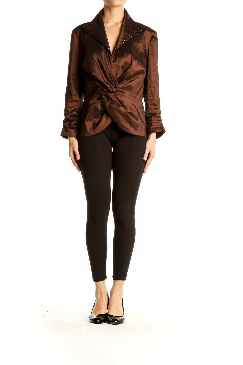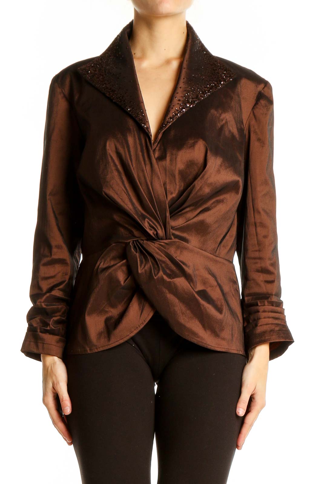 Elevate your style with this stunning brown twist-front blouse by Tadashi. Crafted from a luxurious blend of nylon, polyester, and spandex, this top offers both comfort and elegance. The rich chocolate hue is complemented by a subtle shimmer effect on the collar, adding a touch of glamour to your ensemble. The unique twist-front design creates a flattering silhouette, accentuating your waistline beautifully. Long sleeves and a wide collar provide a sophisticated look, perfect for both office wear and evening outings. In excellent condition, this size Large blouse measures 34" in the bust, 28" in the waist, and 26" in length, ensuring a perfect fit for various body types. The versatile design of this Tadashi blouse makes it an essential addition to any fashion-forward wardrobe.