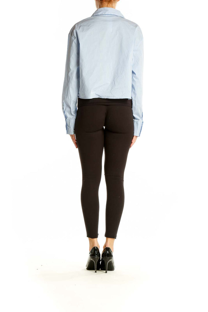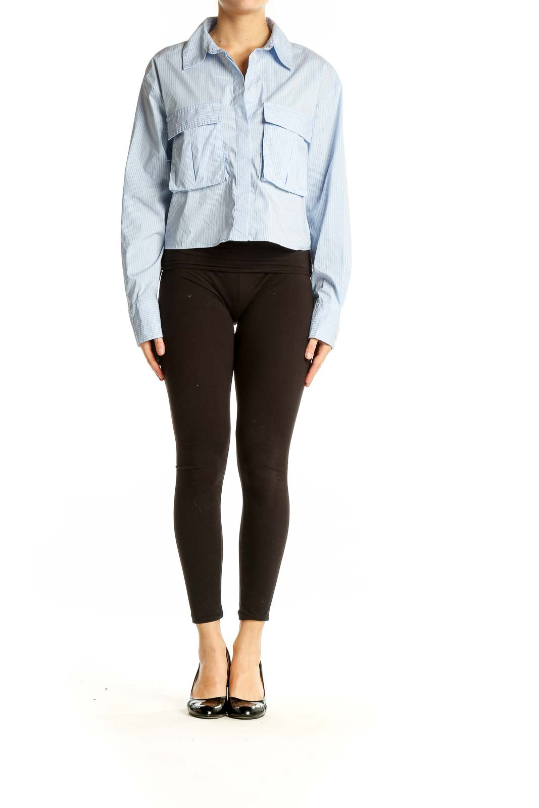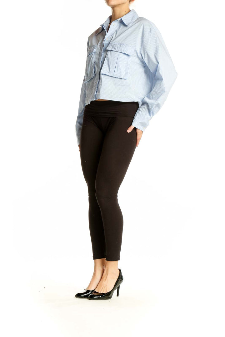 Elevate your casual wardrobe with this chic light blue striped cropped button-up shirt from Zara. This versatile top features a classic collar, long sleeves, and two oversized front pockets, giving it a modern and stylish edge. The cropped length adds a contemporary twist to the traditional button-up design, making it perfect for pairing with high-waisted bottoms.