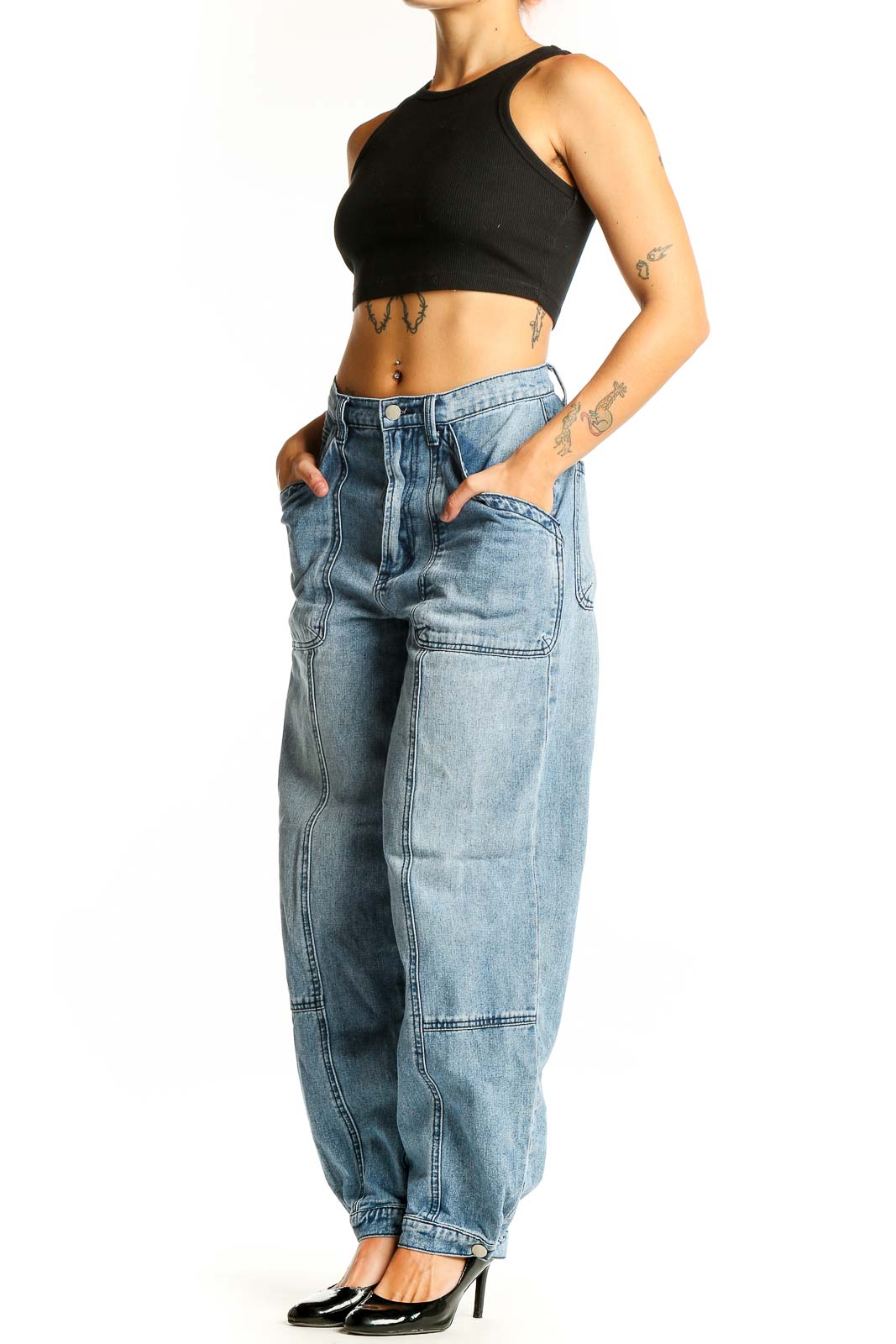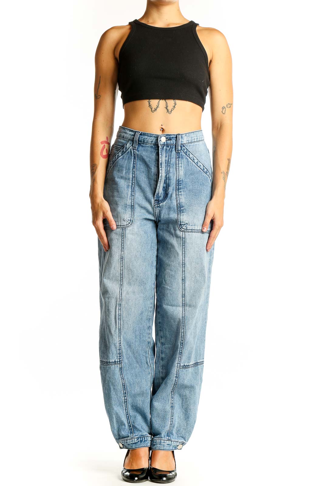 Step into effortless style with these light blue wide-leg carpenter jeans from Elan. Crafted from 100% cotton, these jeans offer both comfort and durability for all-day wear. The relaxed wide-leg silhouette provides a trendy and comfortable fit, perfect for casual outings or laid-back workdays. Large front patch pockets add a utilitarian touch, while the high-waisted design flatters your figure. The light wash denim gives these jeans a versatile, worn-in look that pairs easily with any top in your wardrobe. In good condition, these jeans are a fantastic addition to your denim collection, offering both style and practicality in one fashionable package.