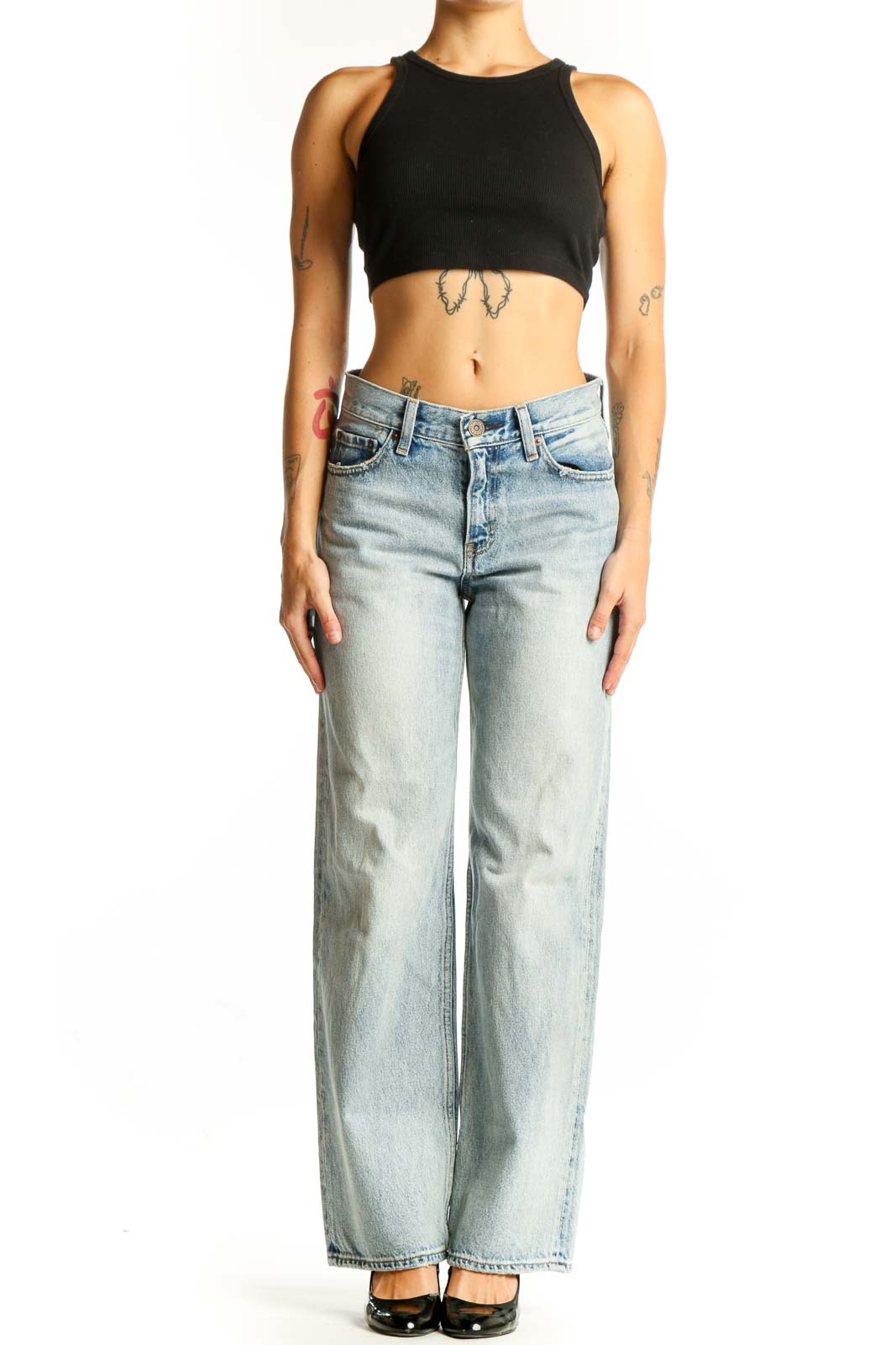 Featuring a classic five-pocket design and a button-fly closure, these jeans are both functional and stylish. The high-rise waist sits comfortably at your natural waistline, creating a sleek silhouette. The generous leg opening allows for easy movement and pairs beautifully with both casual and dressier footwear.