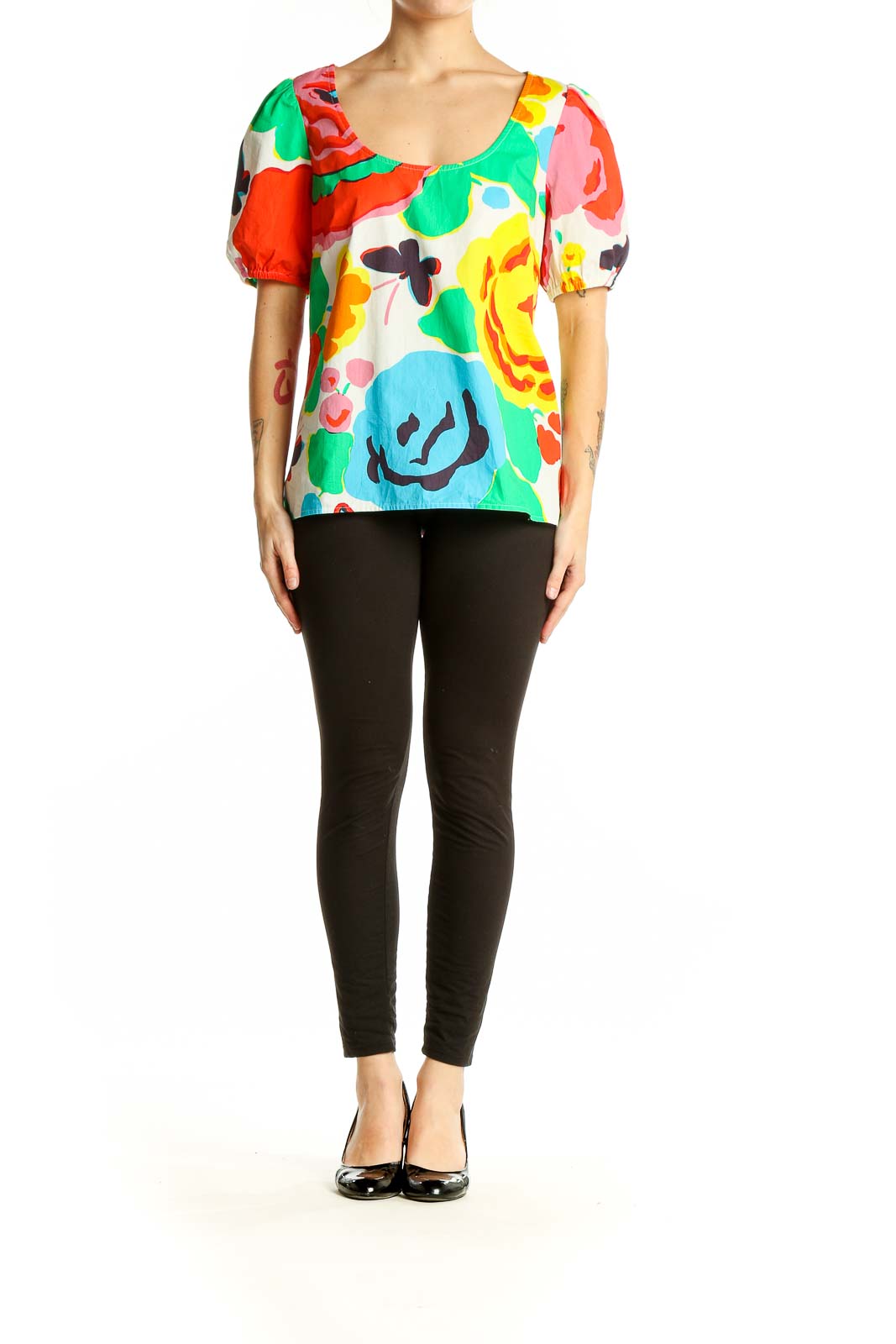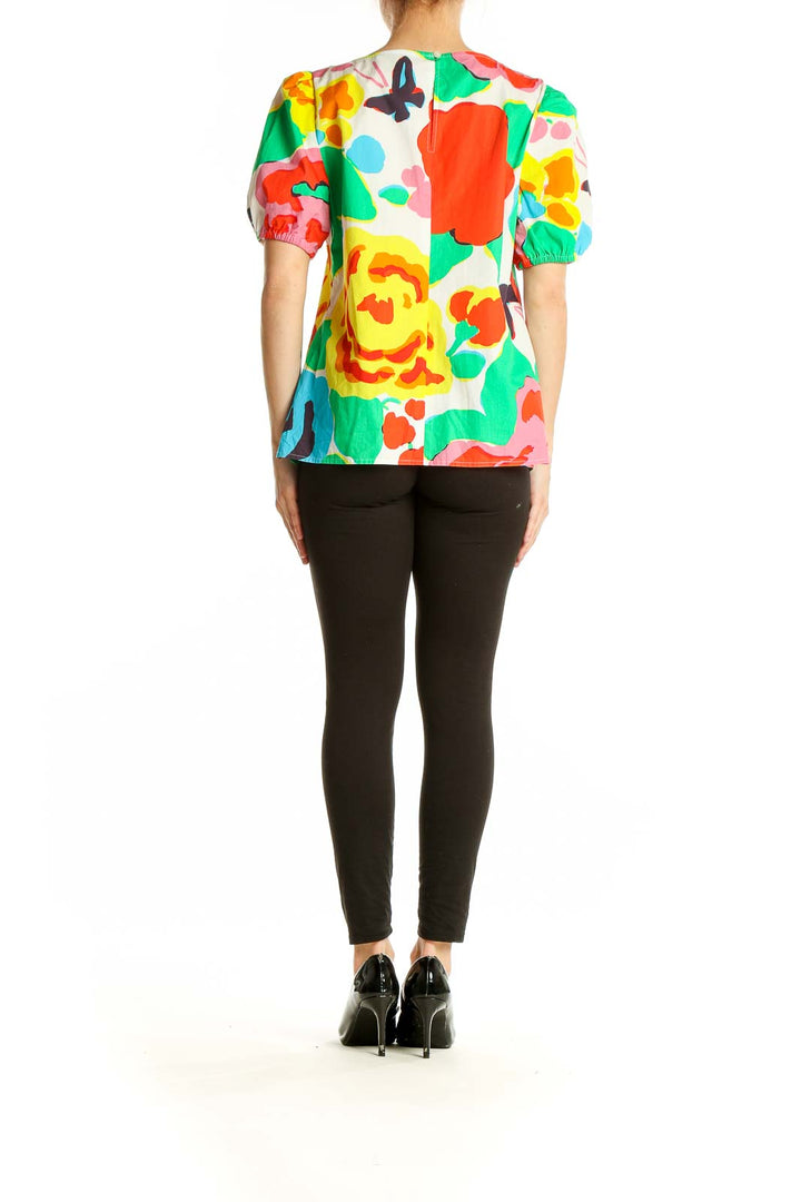 Make a vibrant statement with this eye-catching J.Crew blouse. Featuring a bold, multicolor floral print on a crisp cotton fabric, this top is a perfect blend of comfort and style. The puff sleeves add a touch of whimsy and femininity, while the scoop neckline flatters your décolletage. The relaxed fit through the body ensures all-day comfort, making it ideal for both office wear and casual outings. In excellent condition, this size Large blouse measures 38" in the bust, 36" at the waist, and 23" in length, offering a versatile fit for various body types. The vivid palette of green, yellow, blue, pink, and orange creates a cheerful, summer-ready look that's sure to turn heads.