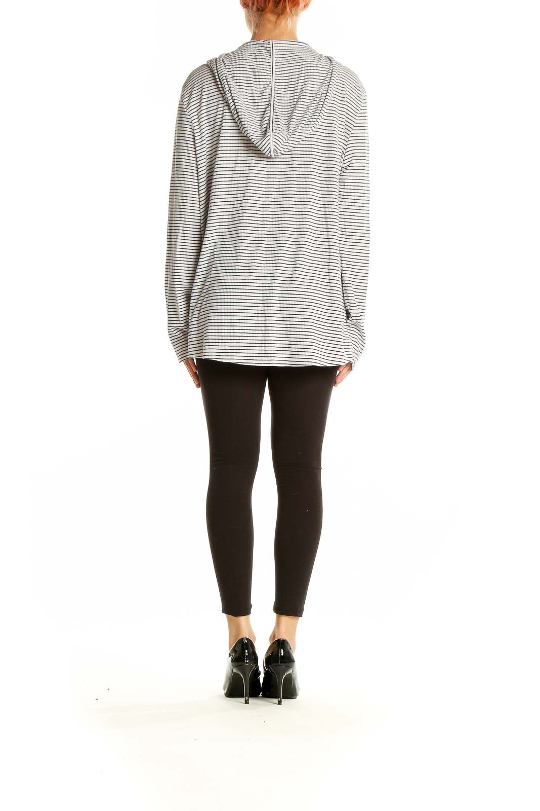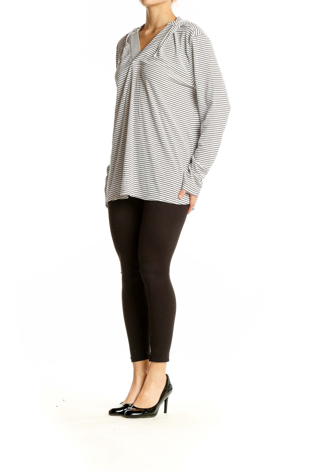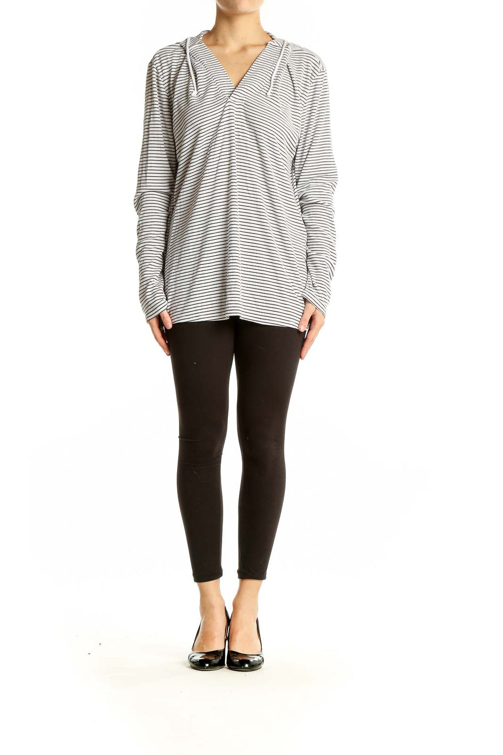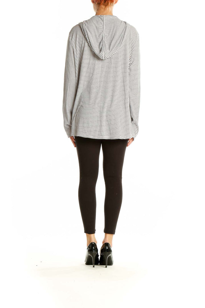 Embrace casual comfort with this stylish white and gray striped hooded knit top from Carve Designs. Perfect for laid-back days or light workouts, this versatile piece features a flattering V-neck design and a cozy hood for added warmth. The horizontal stripe pattern adds a classic touch to this relaxed-fit top, making it easy to pair with your favorite bottoms. Crafted from a soft, stretchy knit fabric, it offers both comfort and flexibility for all-day wear. The long sleeves with ribbed cuffs provide extra coziness, while the generous length allows for various styling options. In excellent condition, this size Large top is a must-have addition to your casual wardrobe.