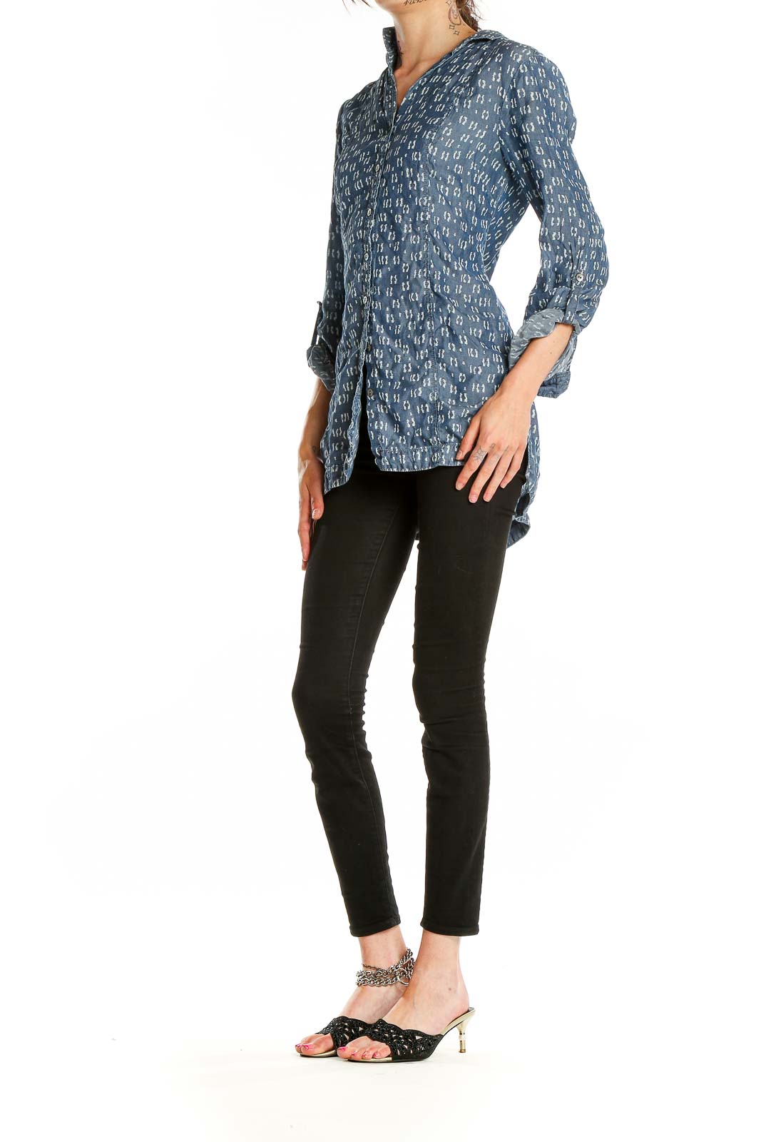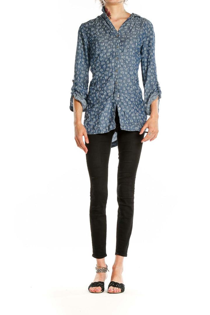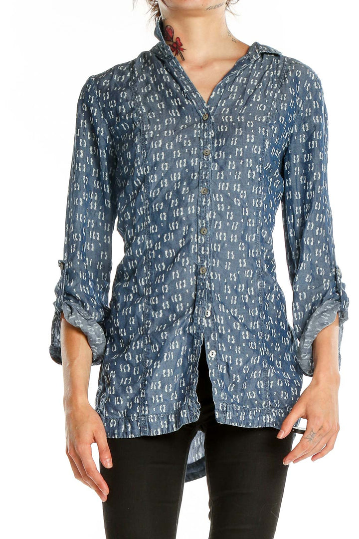 Elevate your casual wardrobe with this stylish blue patterned button-down shirt from NIC + ZOE. The shirt features an allover abstract print in white, creating a visually interesting and modern look. Made from a lightweight, breathable fabric, this top is perfect for year-round wear.