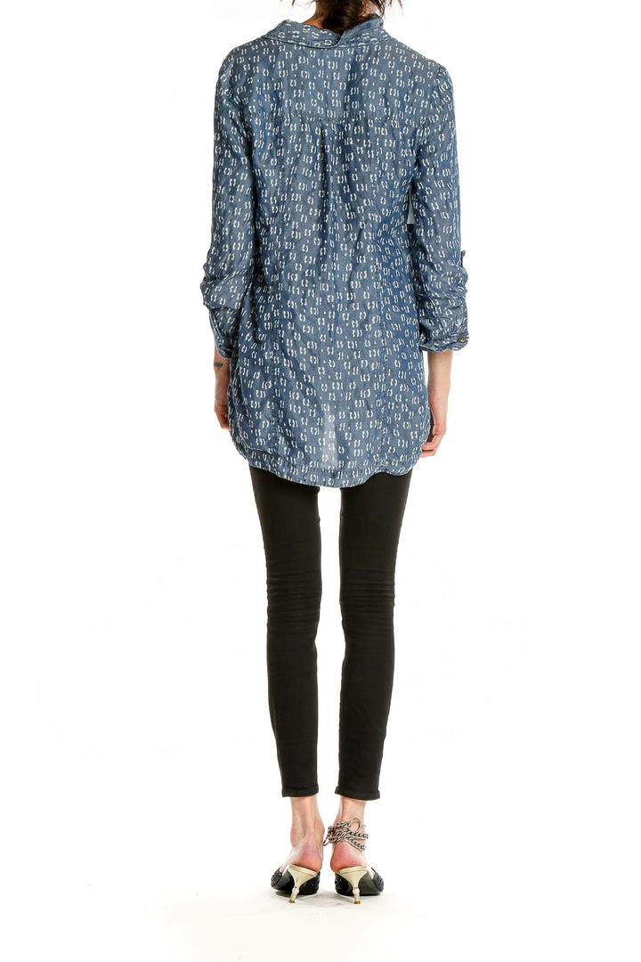 Back view of NIC + ZOE blue patterned button-down shirt on model