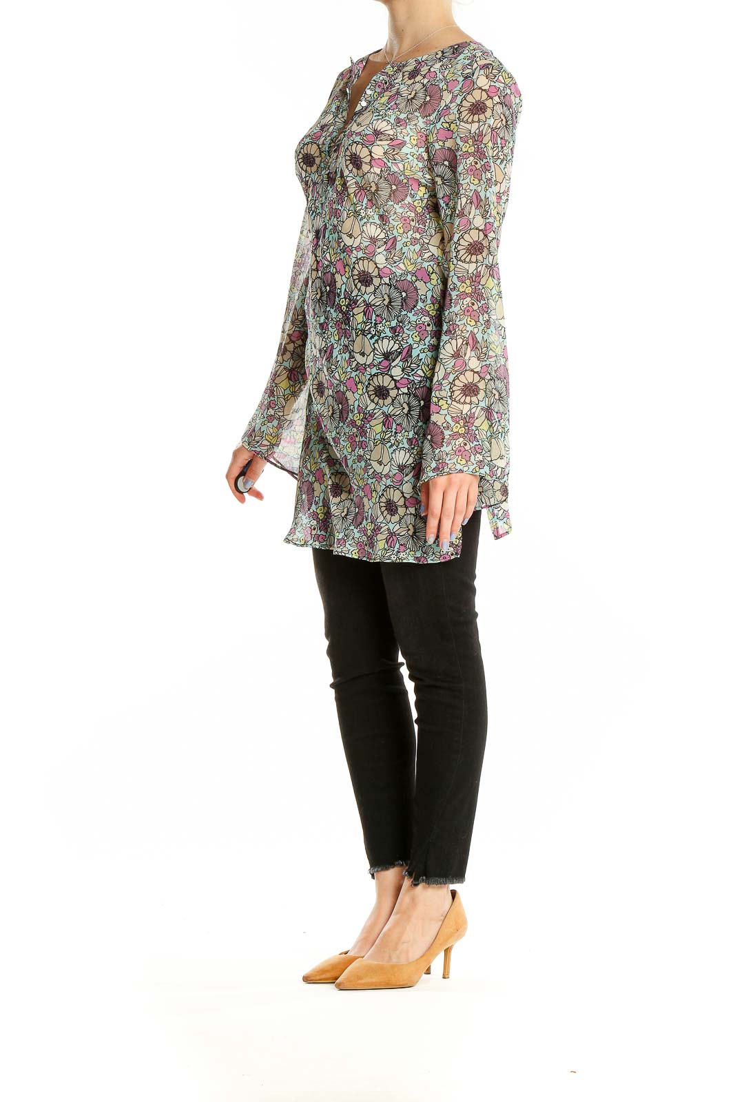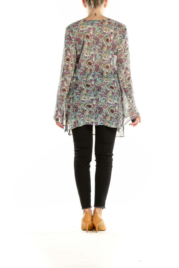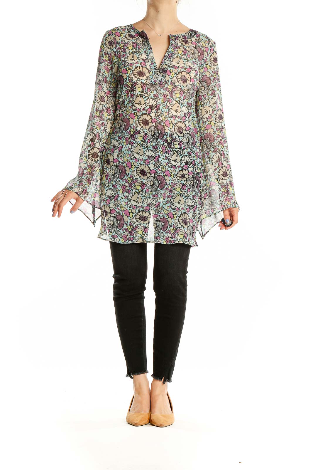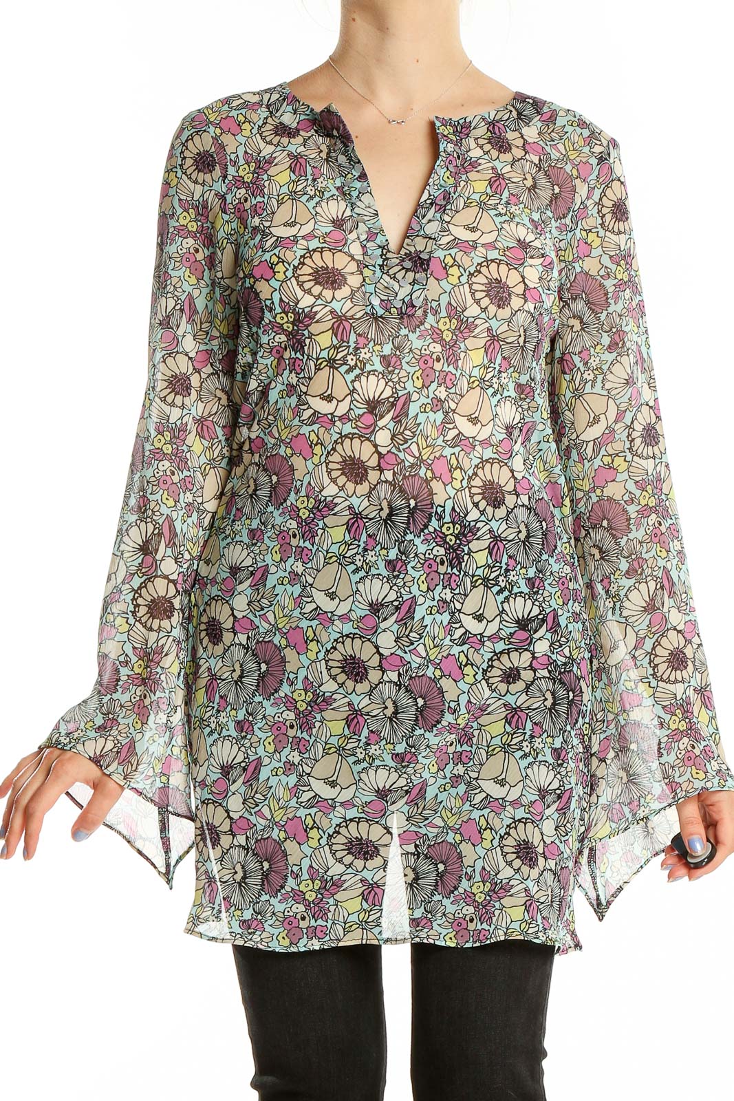 Elevate your wardrobe with this stunning multicolor floral print tunic top by Nicole by Nicole Miller. This eye-catching piece features a vibrant array of pastel-hued flowers scattered across a light background, creating a fresh and feminine look perfect for any season. The flowing silhouette and long bell sleeves add a touch of bohemian charm, while the V-neckline offers a flattering frame for your décolletage. Crafted from lightweight polyester, this top drapes beautifully and ensures all-day comfort. The generous cut and longer length make it versatile enough to pair with leggings or skinny jeans for a chic, put-together outfit. In excellent condition, this size small tunic is a must-have addition to your casual-chic wardrobe.