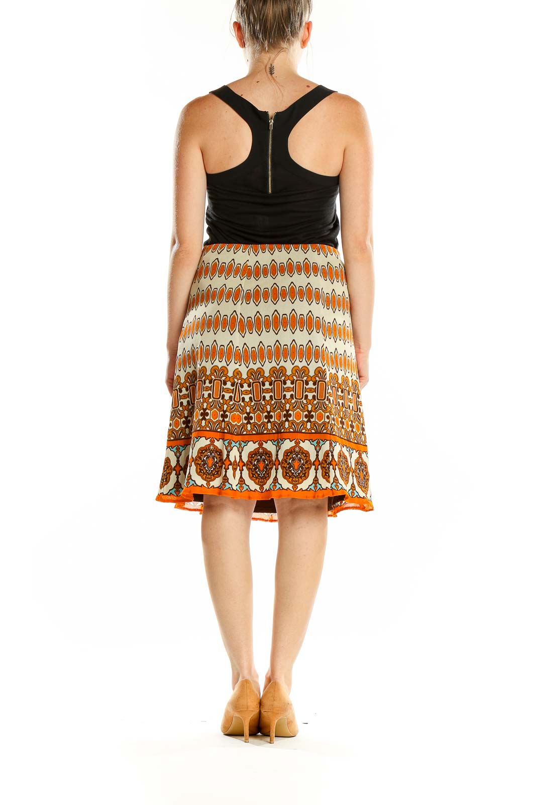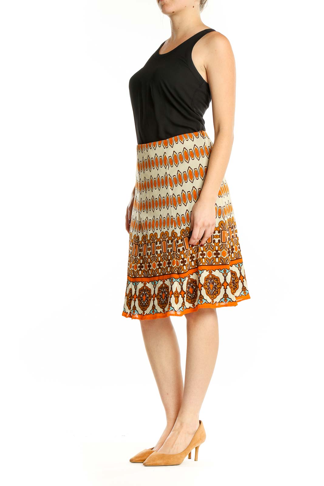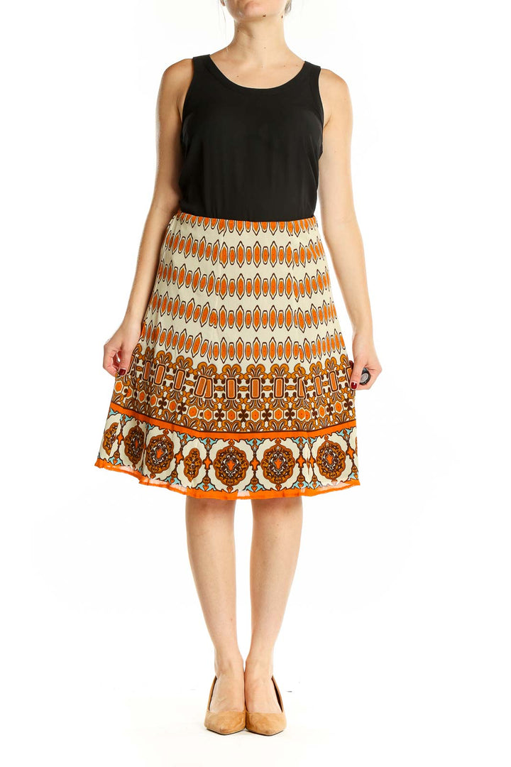 Make a bold statement with this eye-catching orange geometric print A-line skirt by Nicole by Nicole Miller. The vibrant pattern features repeating oval shapes in shades of orange, beige, and brown, creating a mesmerizing retro-inspired look. The skirt's flared silhouette is both flattering and comfortable, perfect for various body types.