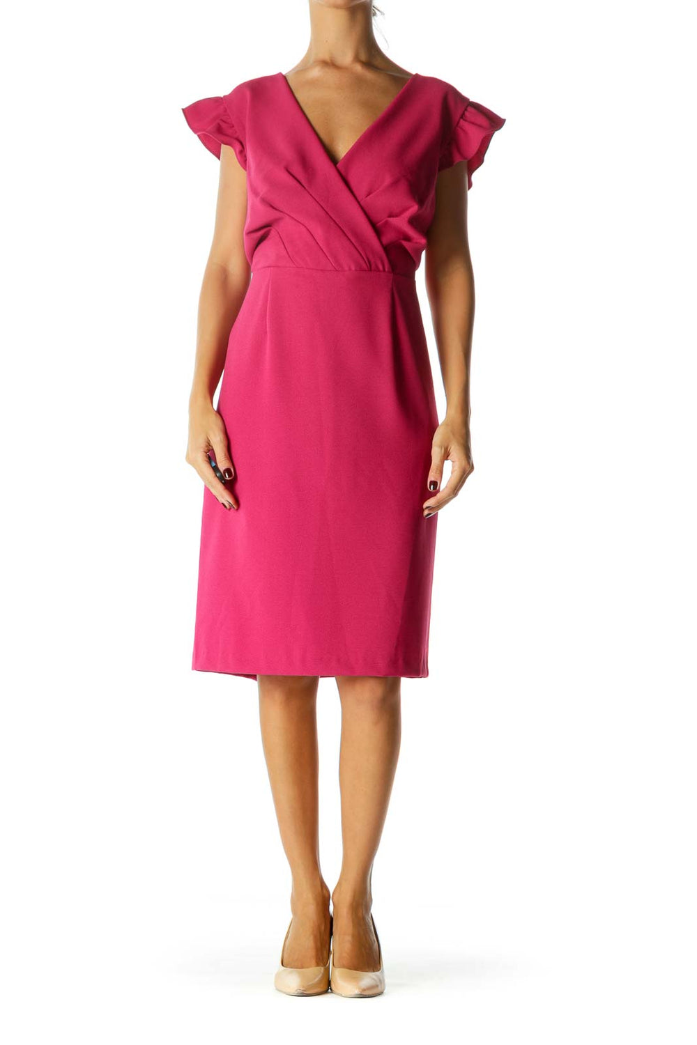 Magenta Pink Flared Sleeves V-Neck Pleated Cocktail Dress