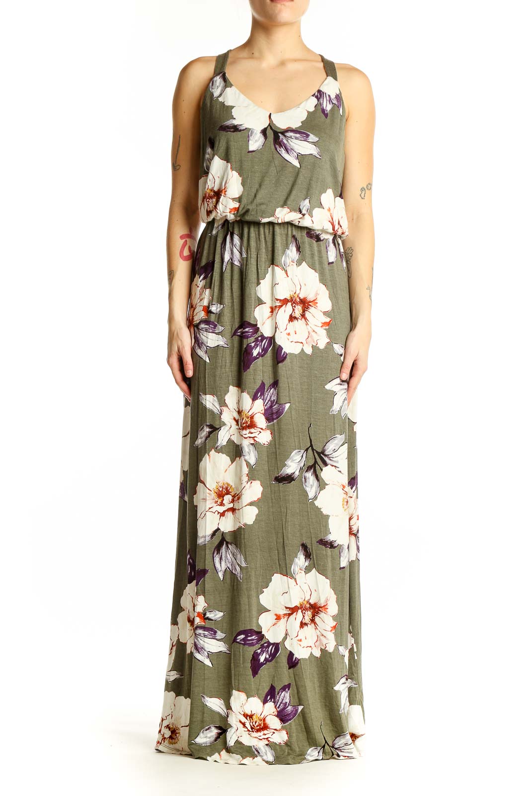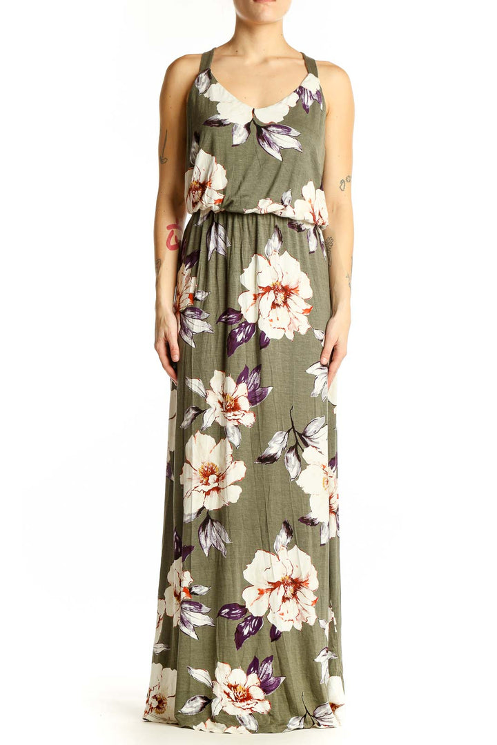 Embrace effortless elegance with this stunning olive floral maxi dress by Nine Britton. The flowing silhouette features a flattering V-neckline and adjustable spaghetti straps, perfect for warm summer days or balmy evenings. Large white and purple blooms dance across the olive green background, creating a romantic and feminine aesthetic.