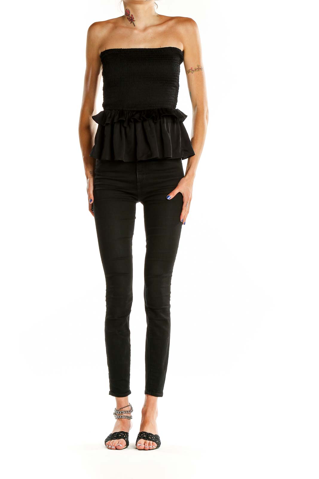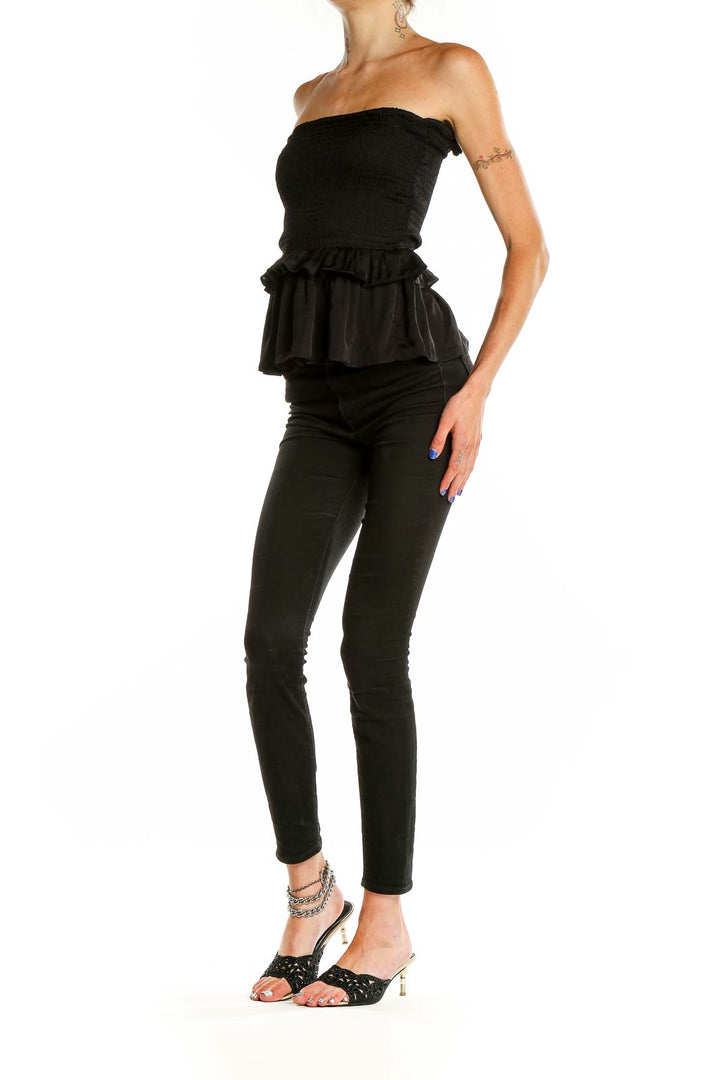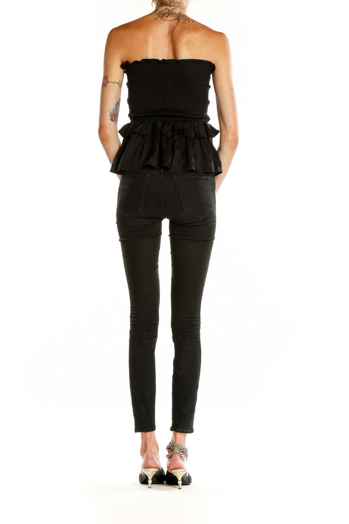 Make a statement with this chic black strapless peplum top from Olivaceous. The smocked bodice offers a comfortable and flattering fit, while the flirty peplum detail adds a touch of feminine flair. Perfect for a night out or a special occasion, this versatile piece can be dressed up or down. The excellent condition ensures you'll look polished and put-together. With its figure-hugging silhouette and measurements of 24" bust, 24" waist, and 16" length, this size small top is designed to accentuate your curves. The strapless design showcases your shoulders, making it an ideal choice for warm weather or layering under a blazer for a more formal look.