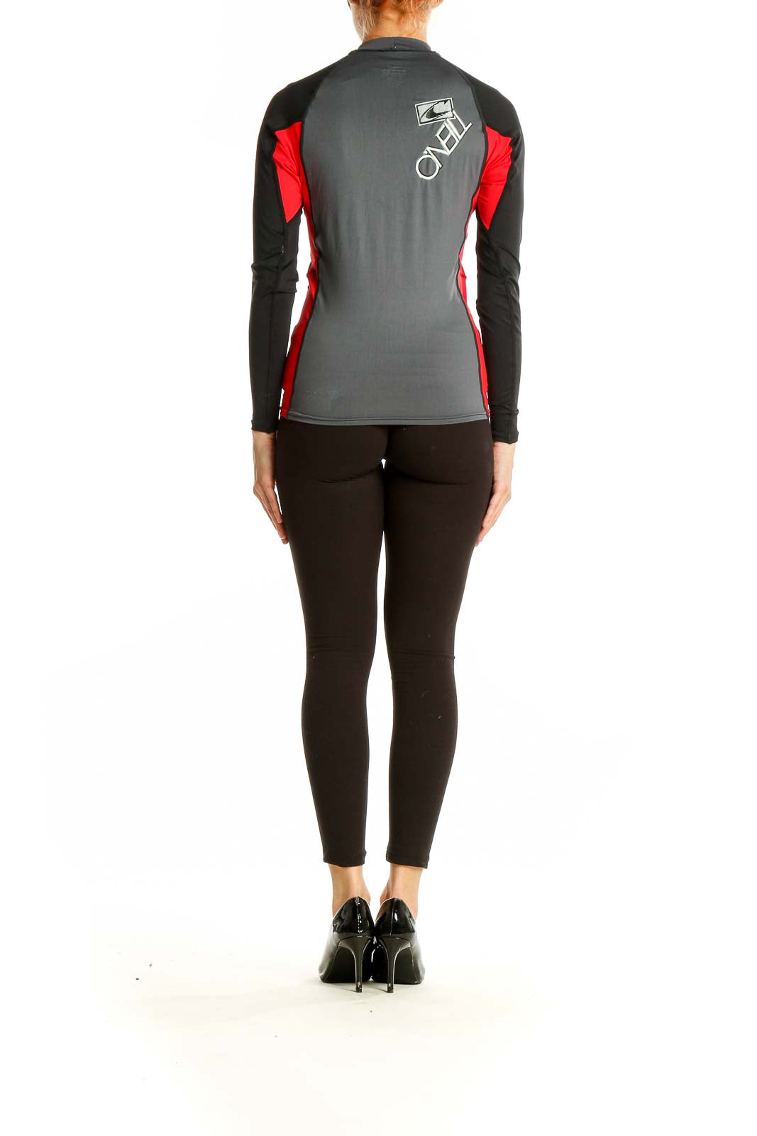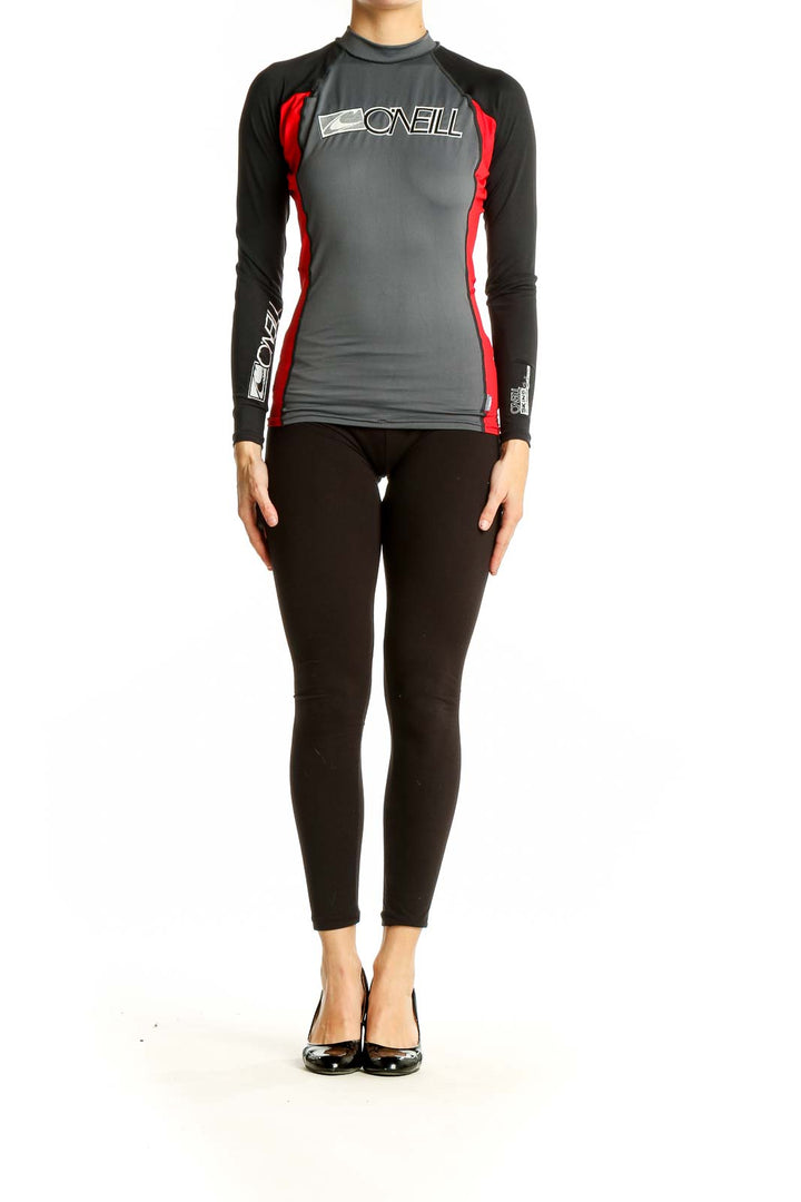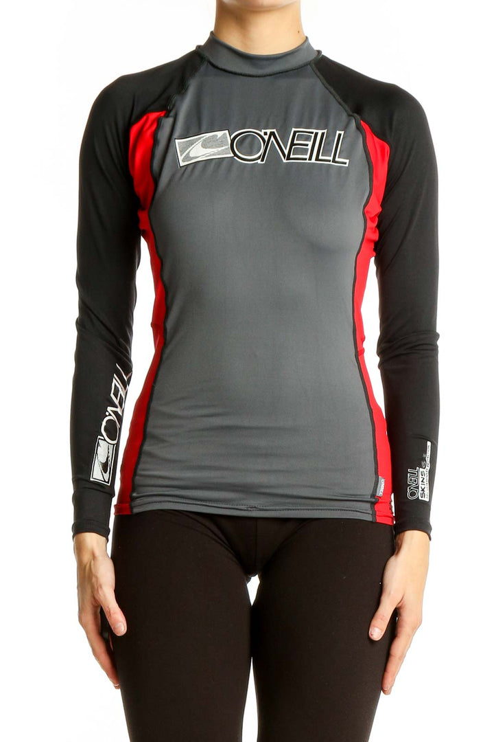 Front view of gray O'Neill rash guard with red side panels and black sleeves