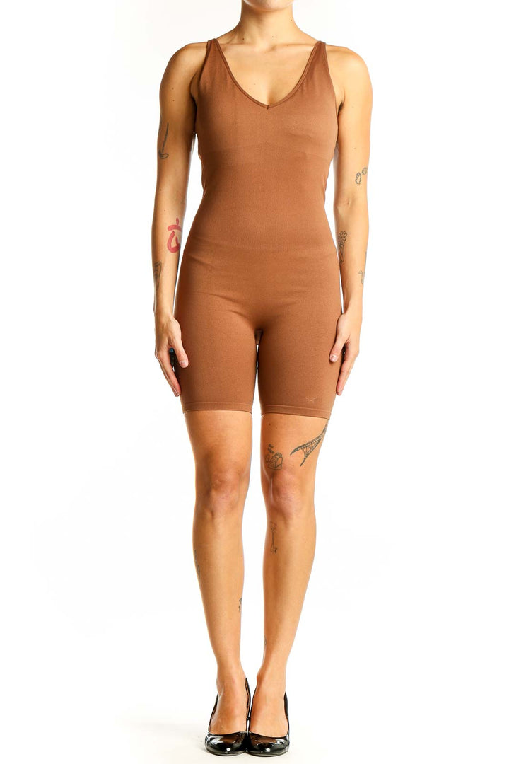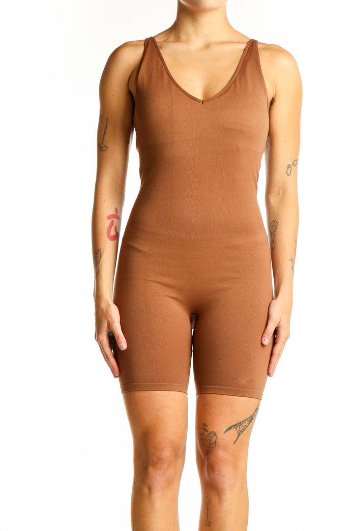 Front view of Pink Active brown bodycon jumpsuit with V-neck