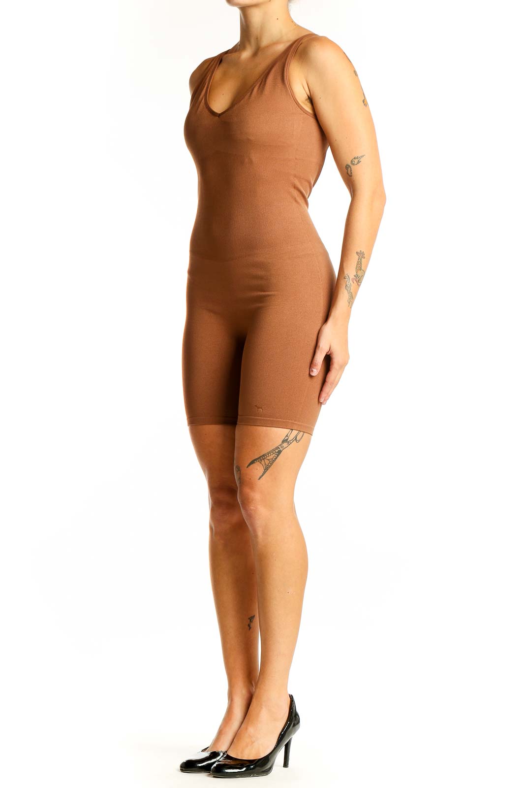 Side view of Pink Active brown bodycon jumpsuit showing sleek fit