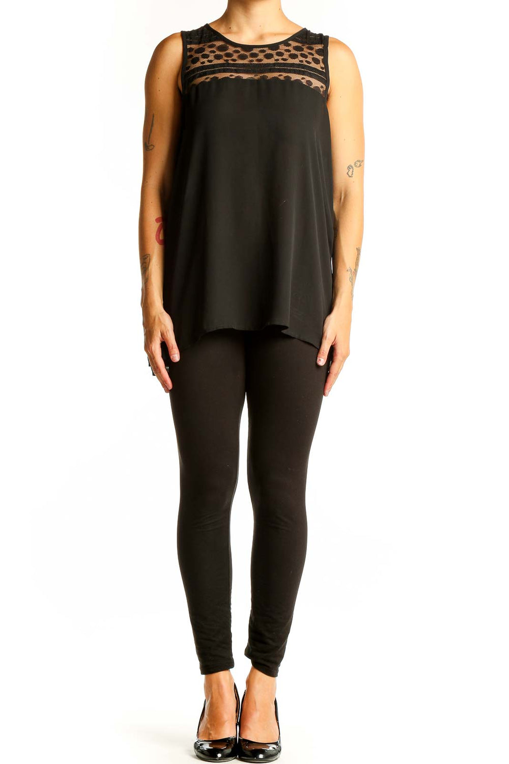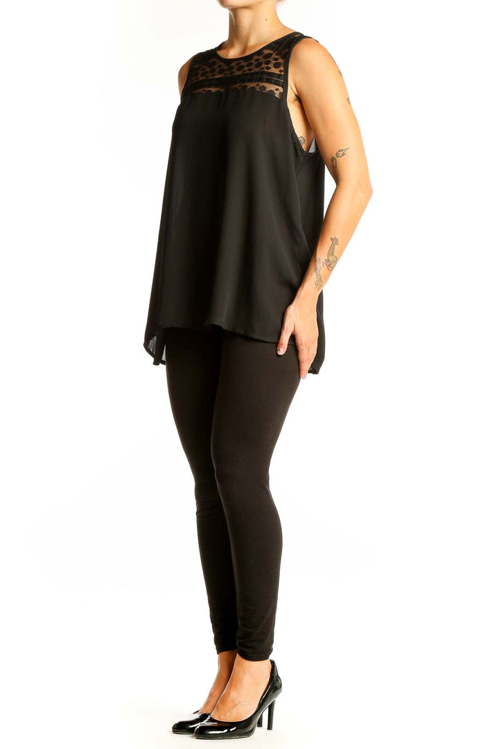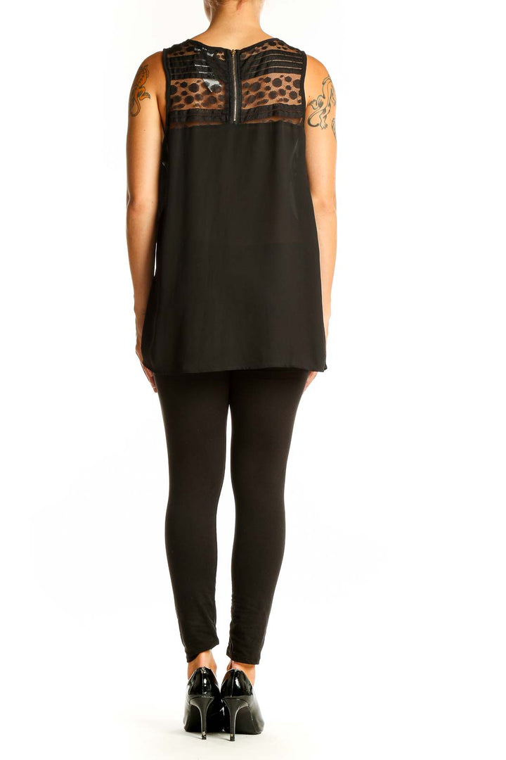 Elevate your wardrobe with this chic Black Sleeveless Polka Dot Mesh Top by Papermoon. This versatile piece features a striking contrast between its solid black body and a delicate polka dot mesh panel at the neckline, adding a touch of playful sophistication to your look. The sleeveless design and flowy silhouette offer both comfort and style, perfect for warm weather or layering.