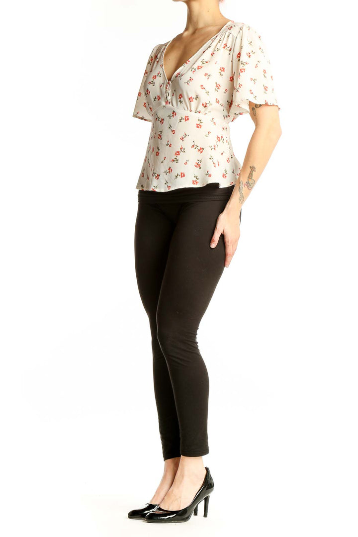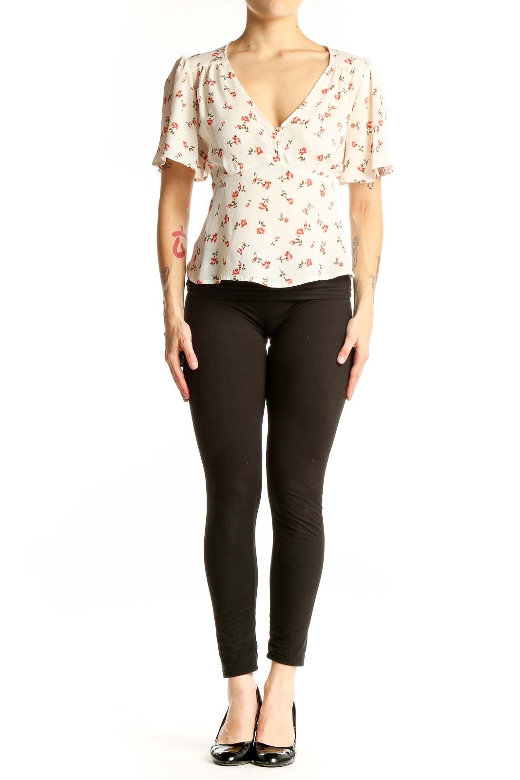 Front view of cream Papermoon blouse with coral floral print and flutter sleeves