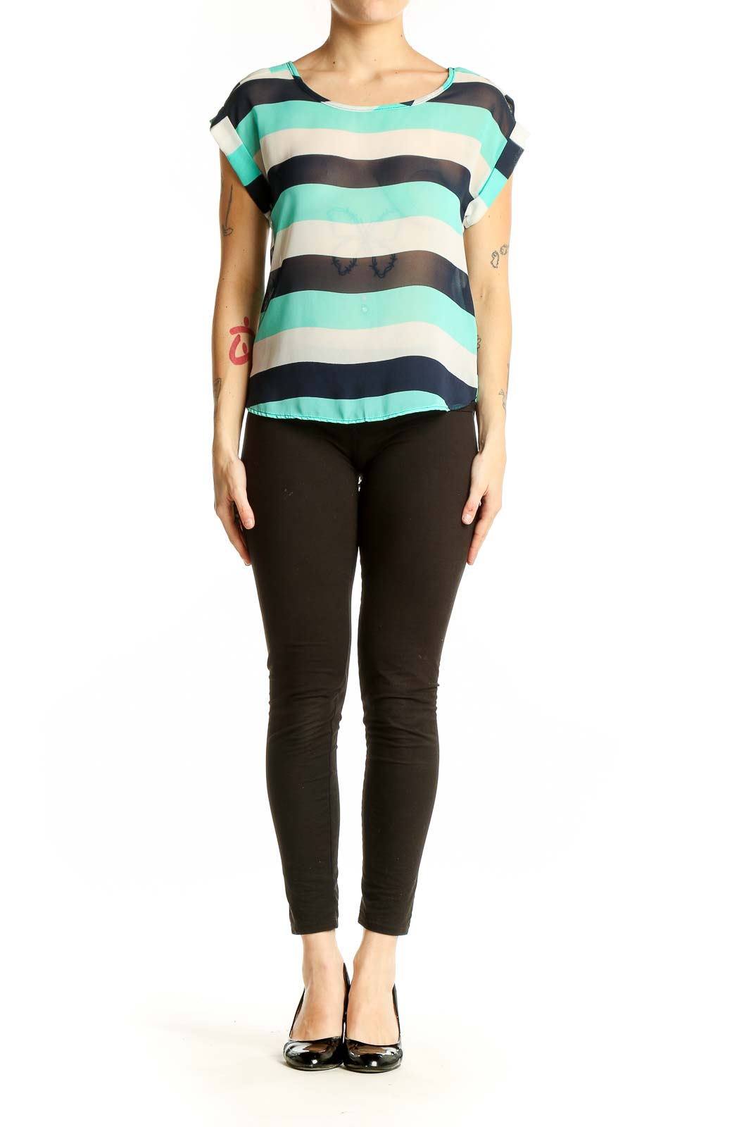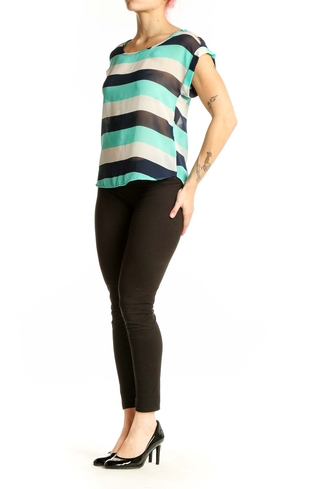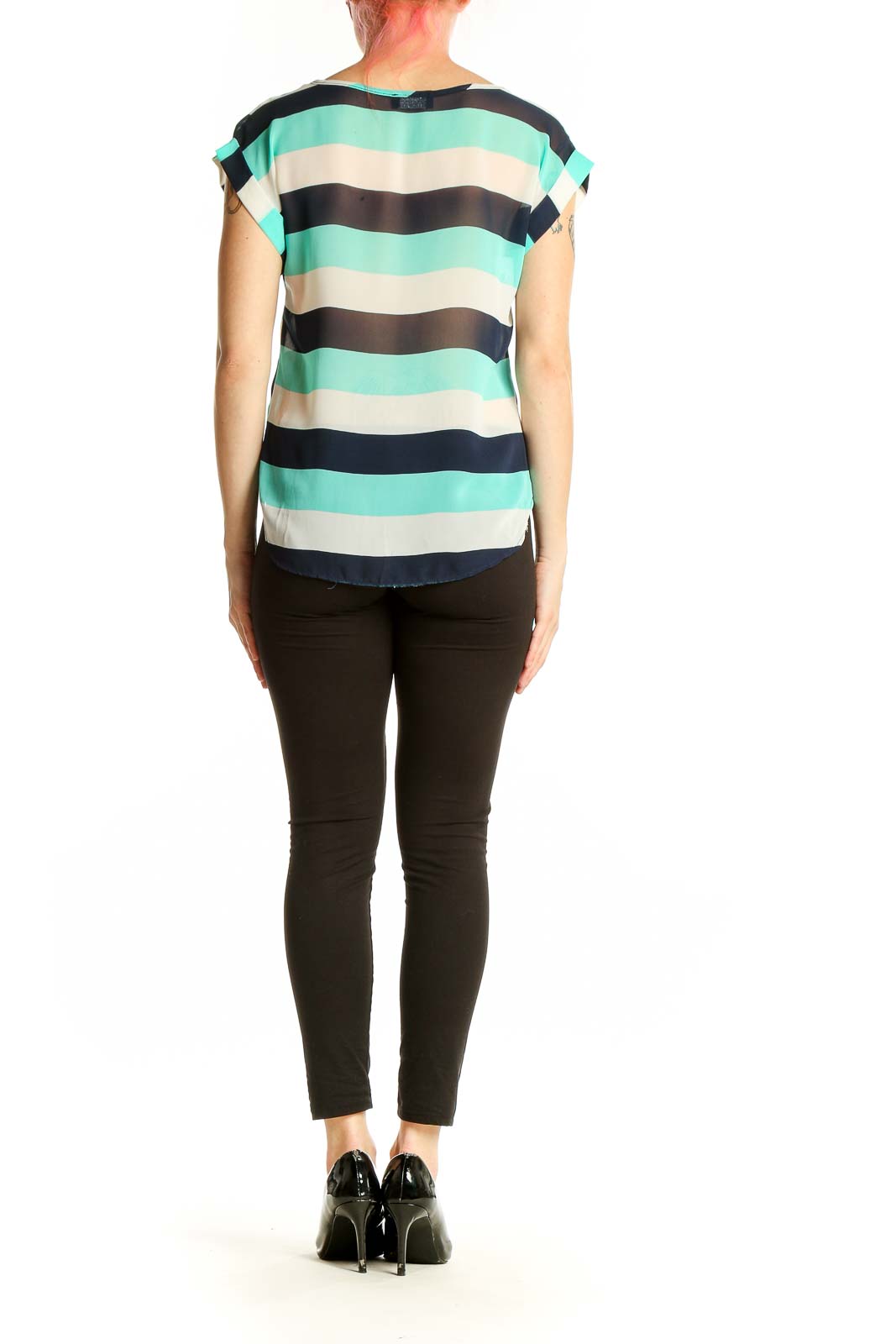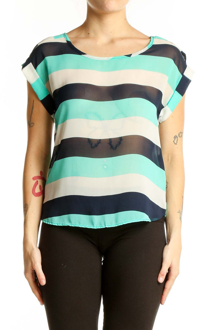 Make a stylish statement with this eye-catching Papermoon sleeveless blouse. Featuring bold horizontal stripes in mint, navy, and cream, this top exudes a fresh and modern vibe perfect for any casual occasion. The lightweight polyester fabric offers a breezy, comfortable feel, ideal for warm weather or layering.