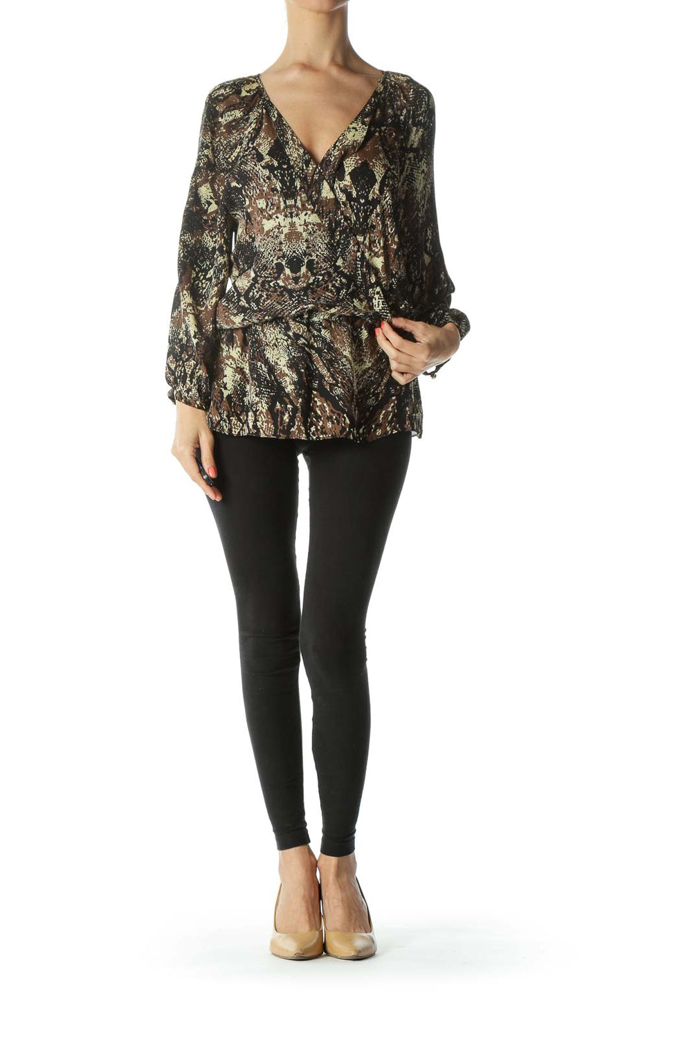 Black/Beige/Green V-Neck Cargo-Print 100% Silk Blouse