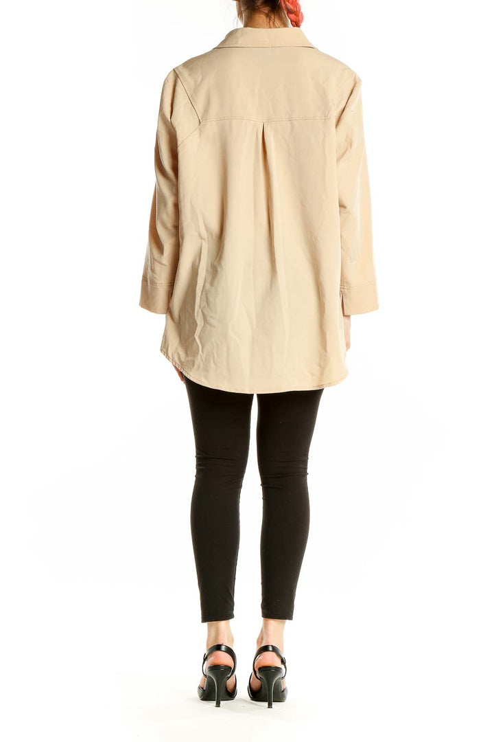 Elevate your wardrobe with this sophisticated beige button-down blouse from Peace of Cloth. Crafted from a luxurious blend of polyester, spandex, and viscose, this top offers both comfort and style. The oversized silhouette provides a relaxed fit, perfect for a variety of occasions. Features include a classic collar, full-length sleeves, and a front button closure. The lightweight fabric drapes beautifully, creating a flattering look for all body types. In good condition, this versatile piece can be easily dressed up or down, making it a must-have addition to your closet.
