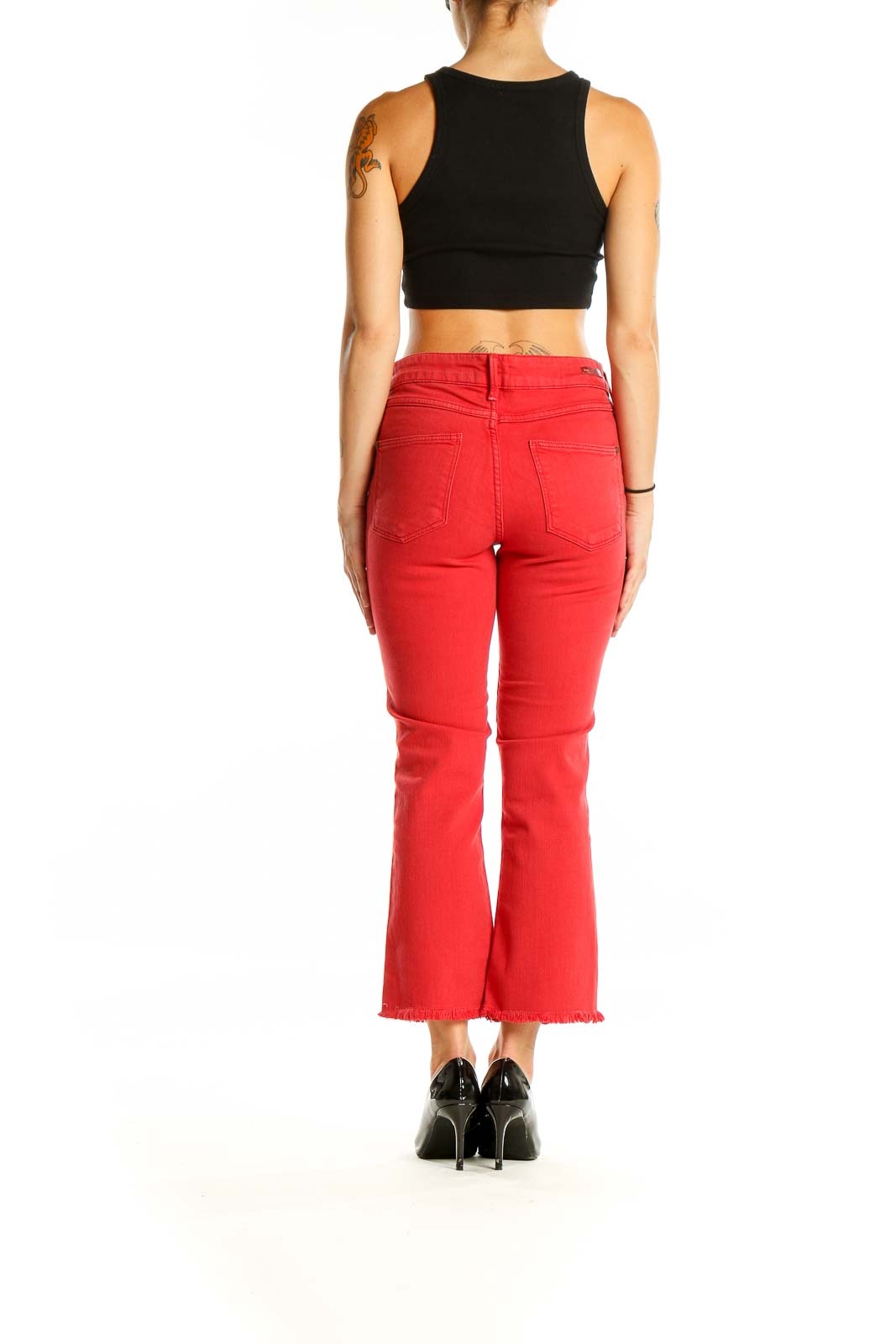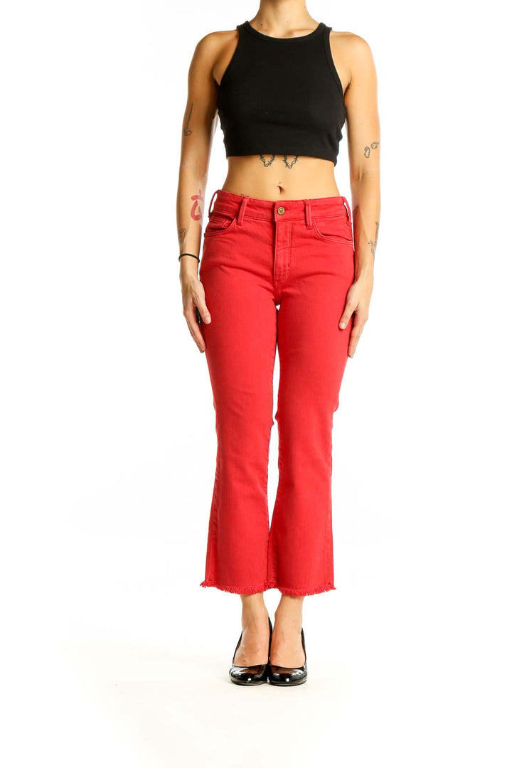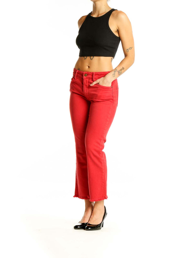 Make a bold statement with these vibrant red cropped flare jeans from Pilcro and the Letterpress. Crafted from a comfortable cotton-elastane blend, these jeans offer both style and flexibility. The cropped length hits just above the ankle, making them perfect for showcasing your favorite shoes. The flared silhouette adds a touch of retro charm while flattering your figure. With a high-rise waist and frayed hem detailing, these jeans combine contemporary trends with classic denim appeal. The excellent condition ensures you'll look fresh and polished every time you wear them. Whether you're dressing up for a night out or keeping it casual for a weekend brunch, these eye-catching red jeans are sure to turn heads.