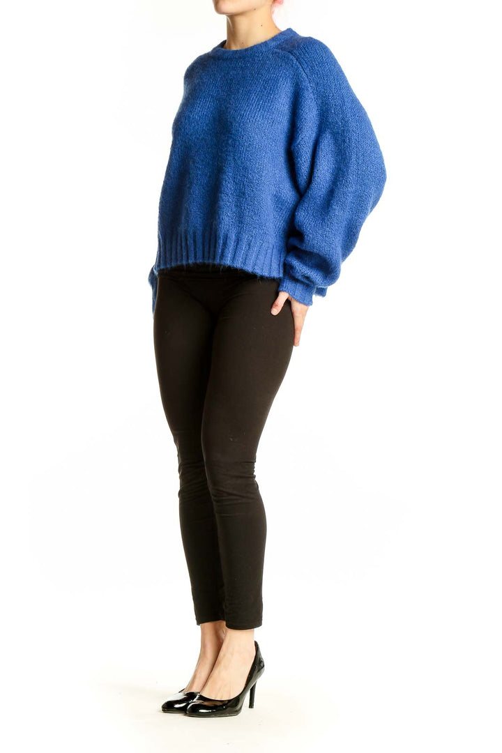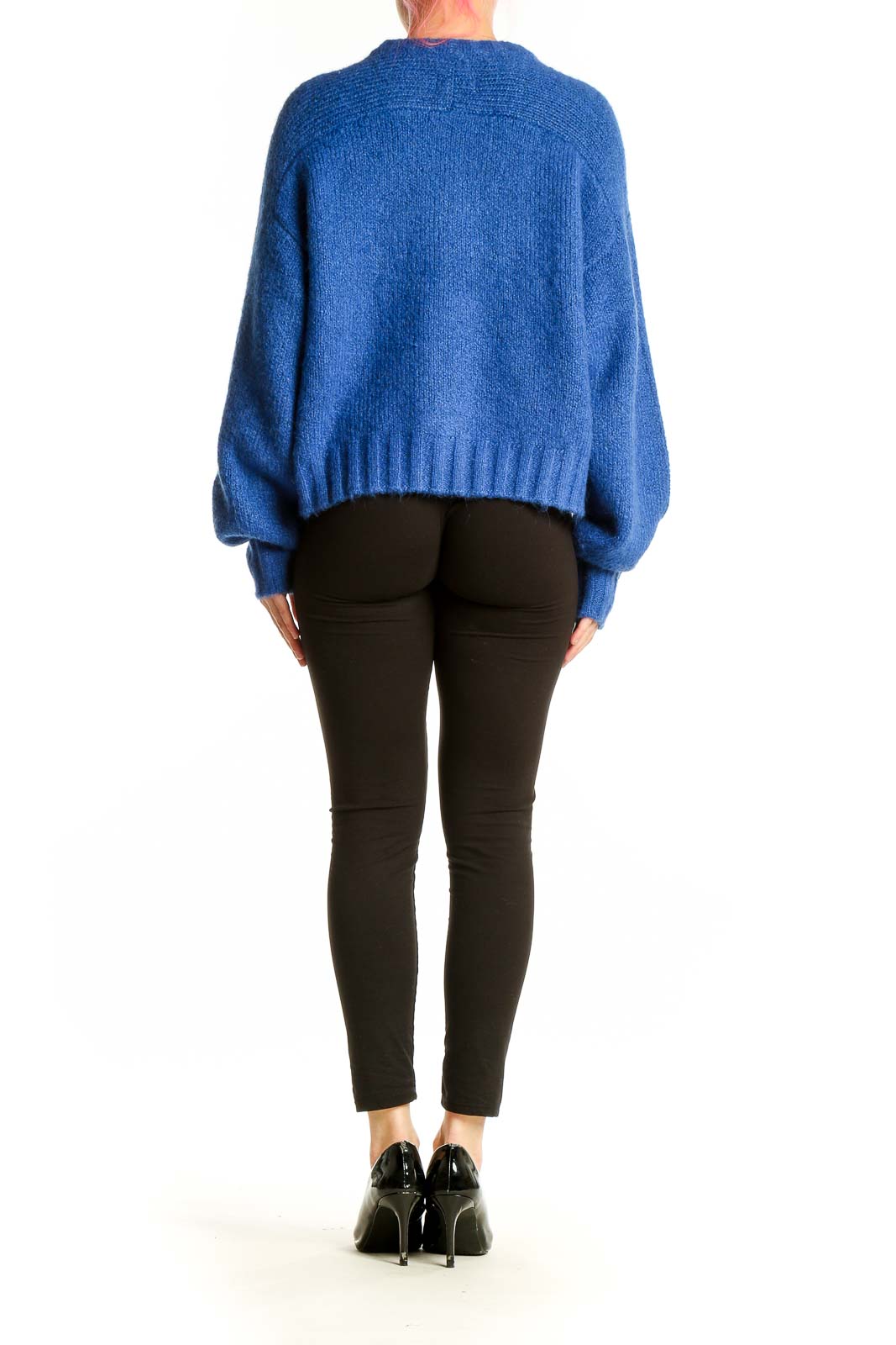 Designed with a relaxed fit, this sweater boasts voluminous balloon sleeves and a slightly cropped length, hitting just above the hips. The ribbed cuffs and hem provide a polished finish while ensuring a snug fit. With measurements of 25" in the bust, 22" in length, and 22" at the waist, this medium-sized sweater offers a comfortably roomy silhouette that's perfect for layering.