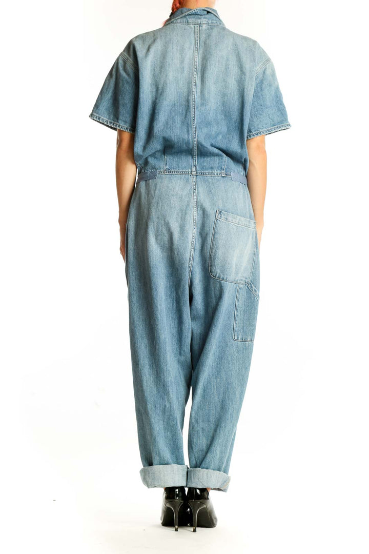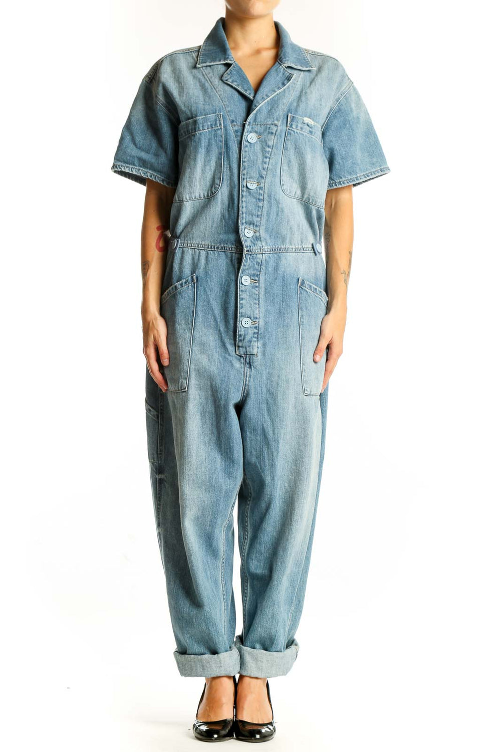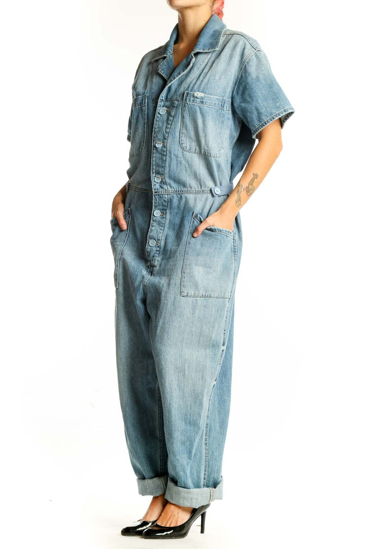 Step into effortless style with this light blue denim jumpsuit from Pistola. Crafted from soft, breathable cotton, this all-in-one piece features a classic collar, short sleeves, and a button-down front for a casual yet put-together look. The relaxed fit through the body and legs offers comfort and versatility, perfect for various occasions. Multiple pockets, including chest and hip pockets, provide practicality without compromising on style. The light wash denim gives a laid-back, vintage-inspired vibe that pairs well with both casual and dressier accessories. In good condition, this jumpsuit is a versatile addition to any wardrobe, easily dressed up or down for different looks.