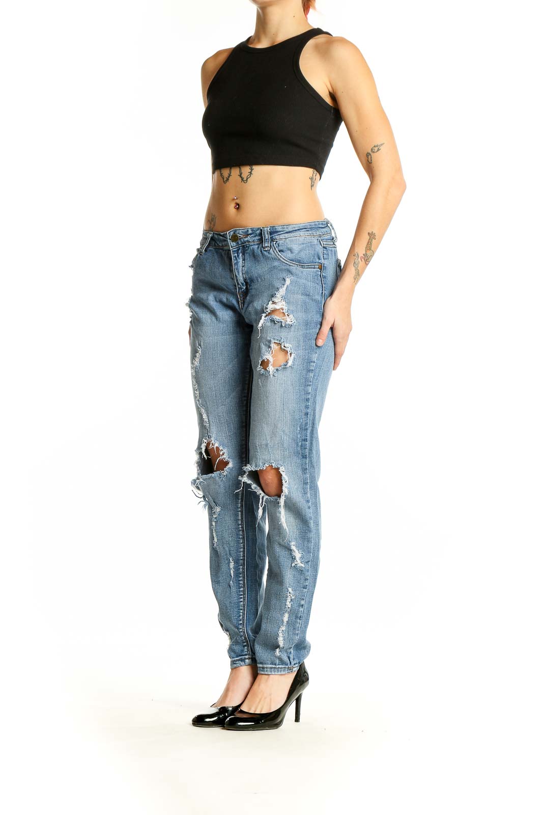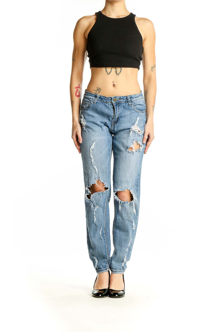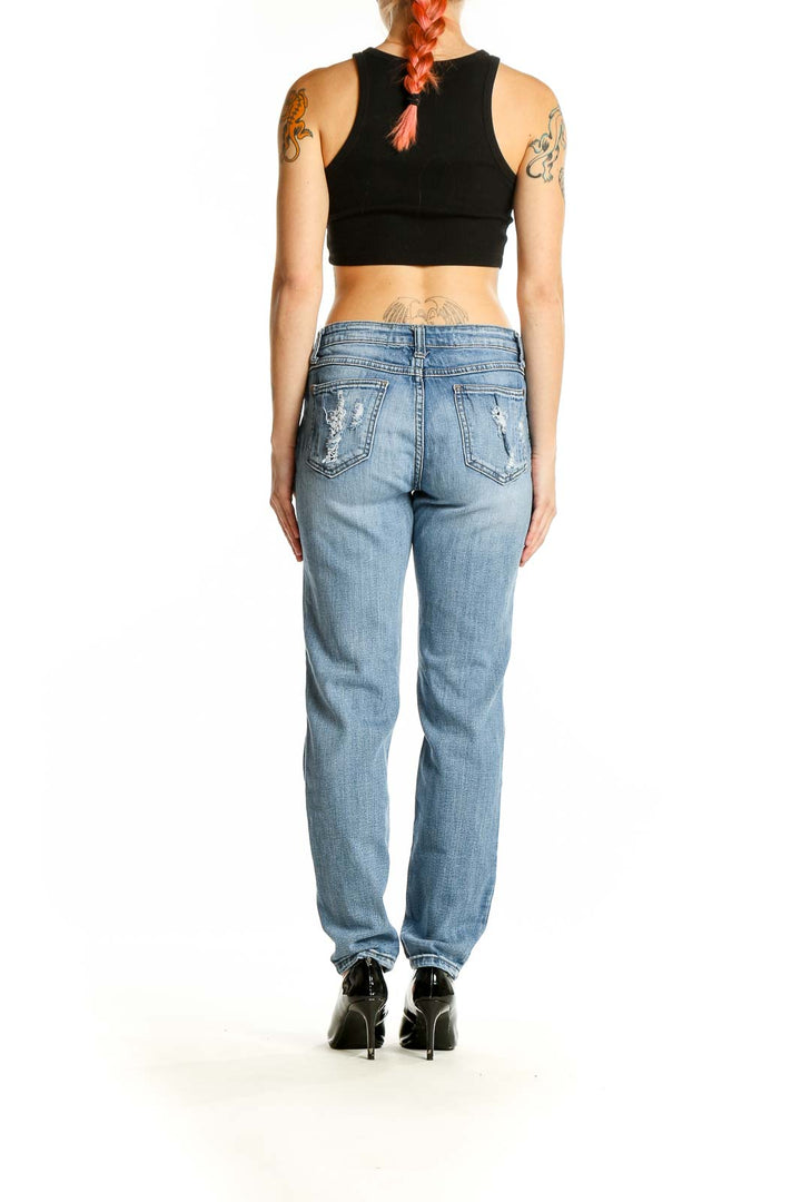 Make a statement with these edgy Light Blue Distressed Boyfriend Jeans from Pistola. Crafted from a comfortable blend of Algadon, Cotton, and Lycra, these jeans offer both style and flexibility. The relaxed boyfriend fit provides a laid-back vibe, while the strategically placed distressing adds a touch of rebellious charm. Featuring rips and tears across the legs, these jeans embody the perfect balance of casual cool and trendy appeal. The light blue wash is versatile enough to pair with any top in your wardrobe. With a mid-rise waist and a straight leg, these jeans flatter various body types. The good condition ensures you'll enjoy these jeans for many wears to come. Measurements include a 29" waist, 34" hips, and a 35" length, making them ideal for a range of heights. Whether you're running errands or meeting friends for brunch, these Pistola jeans will keep you looking effortlessly stylish.