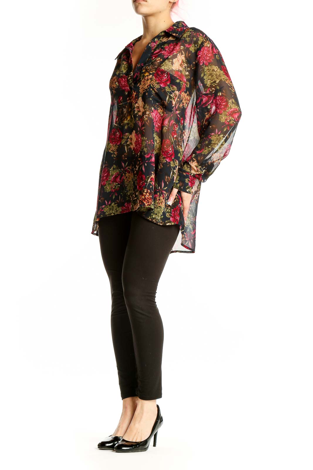Front view of Pleione black floral sheer button-up blouse with red and pink flowers