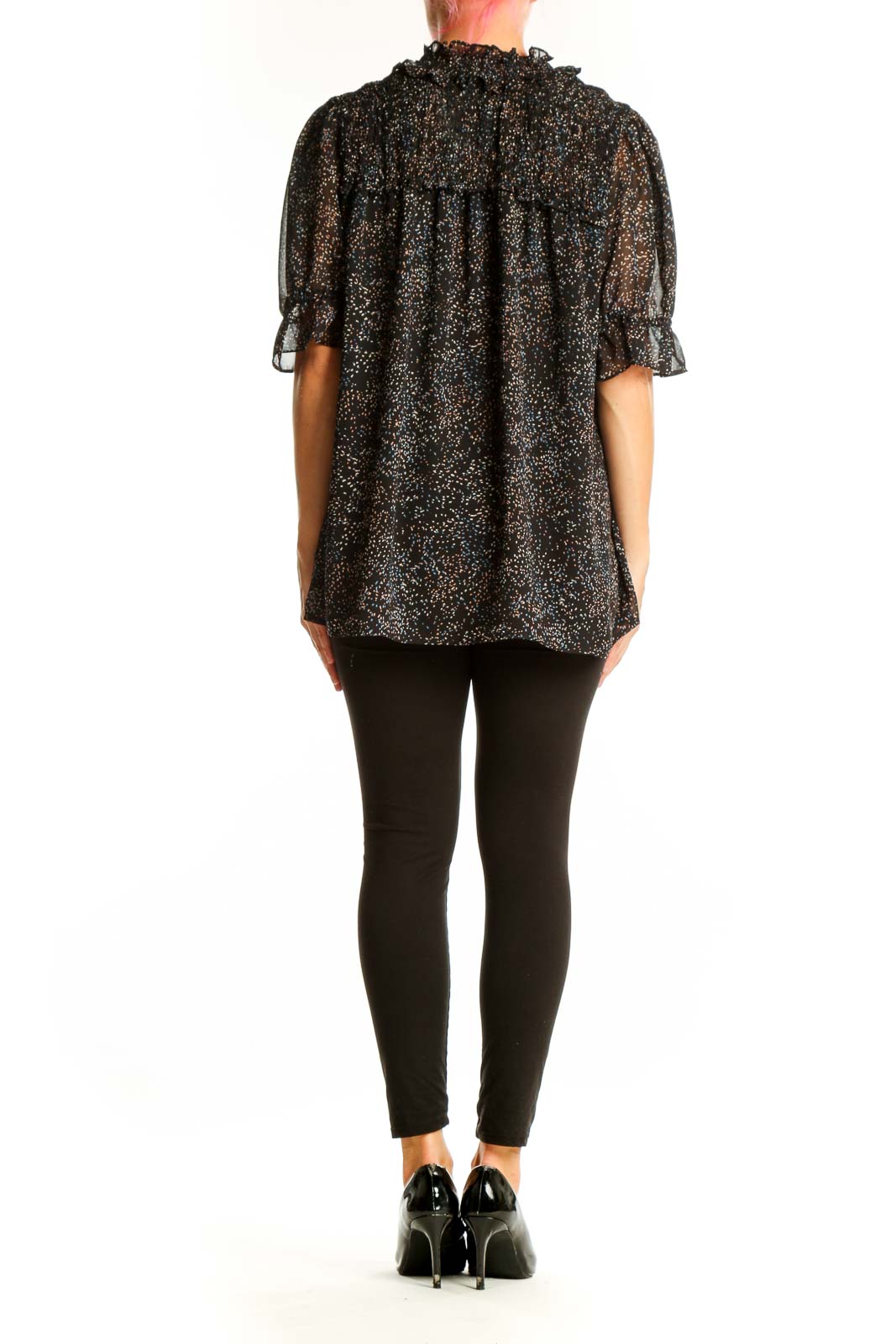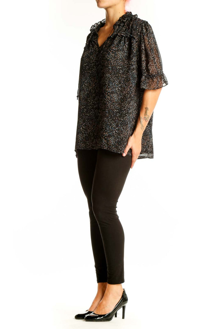 Elevate your wardrobe with this stunning black speckled sheer blouse from Pleione. The delicate all-over speckle print in shades of white and light blue adds a touch of whimsy to this sophisticated top. Featuring a feminine ruffle-neck detail and flowy short sleeves with ruffle cuffs, this blouse exudes elegance and charm. The sheer polyester fabric drapes beautifully, creating a flattering silhouette for all body types. With its generous XL size and measurements of 46" bust, 44" waist, and 26" length, this top offers both style and comfort. The excellent condition ensures you'll look polished and put-together for any occasion. Whether paired with sleek trousers for the office or dressed up with a skirt for evening events, this versatile Pleione blouse is sure to become a favorite in your collection.