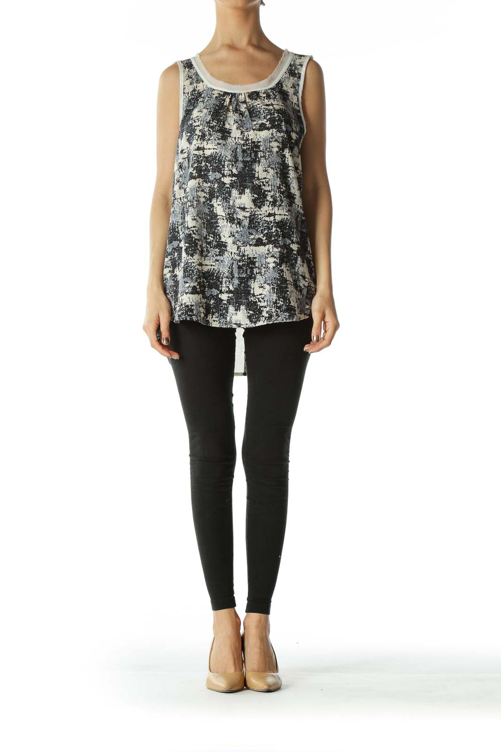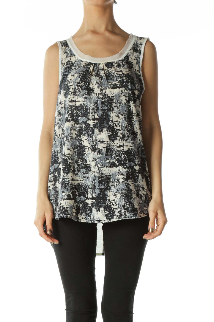 Navy White and Gray Abstract Graphic Sleeveless Blouse with Raw Hem Neckline