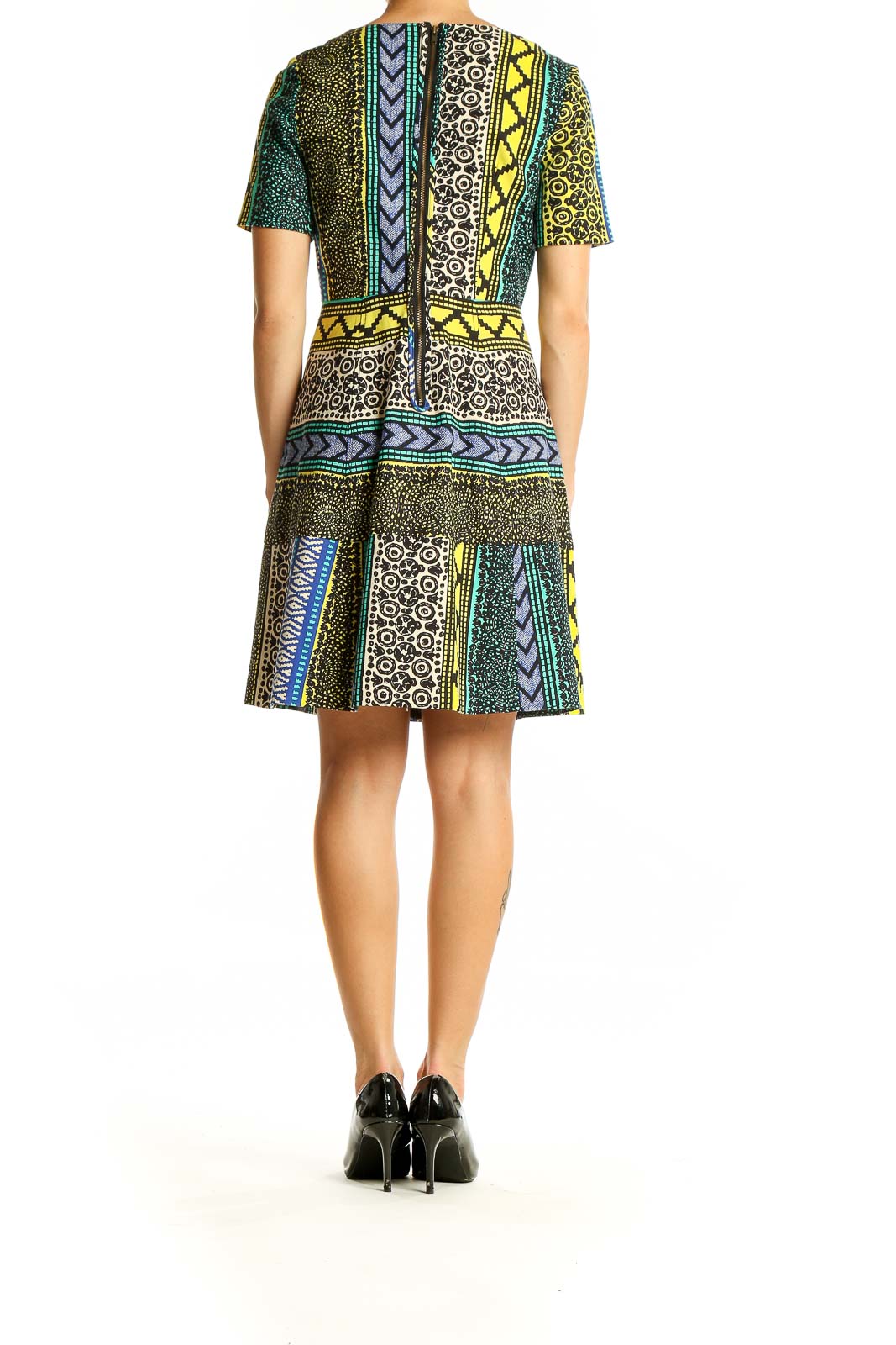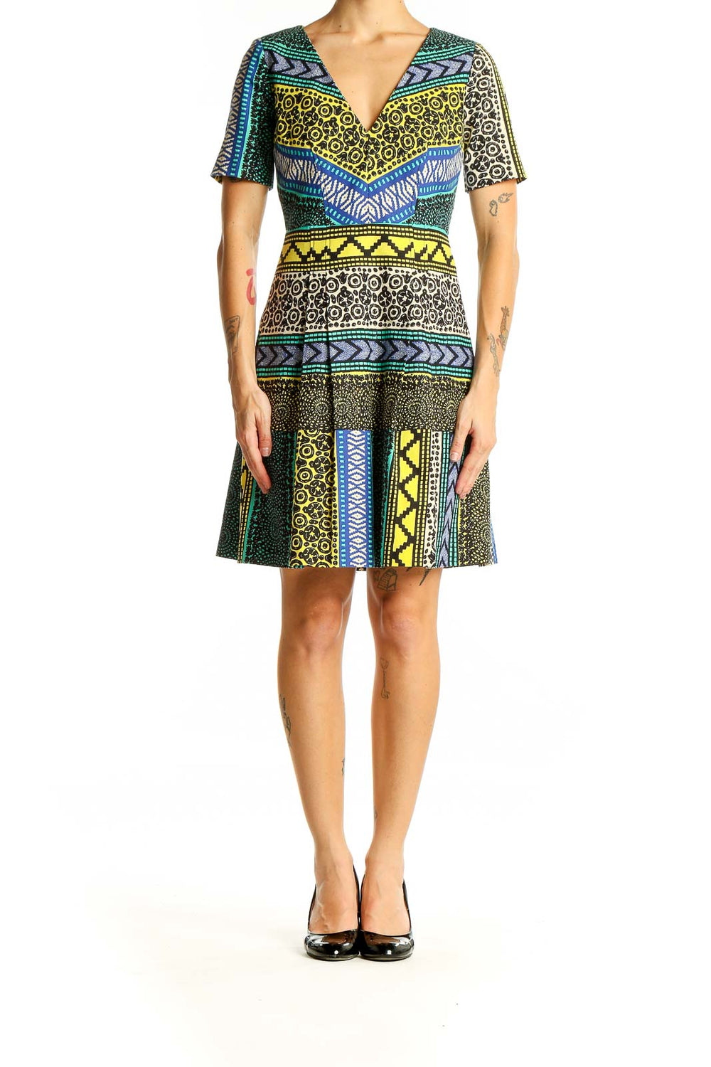Make a bold statement with this vibrant Plenty by Tracy Reese dress. Featuring an eye-catching geometric print in a kaleidoscope of colors including green, yellow, blue, and black, this dress is sure to turn heads. The flattering V-neckline and short sleeves offer a perfect balance of style and comfort. Crafted from a blend of cotton, polyester, and spandex, this dress provides both breathability and stretch for all-day wear. The A-line silhouette with a fitted waist accentuates your curves while the knee-length hem keeps it versatile for various occasions. In excellent condition, this XS size dress is a must-have addition to your wardrobe for those who love to stand out with unique, artistic pieces.