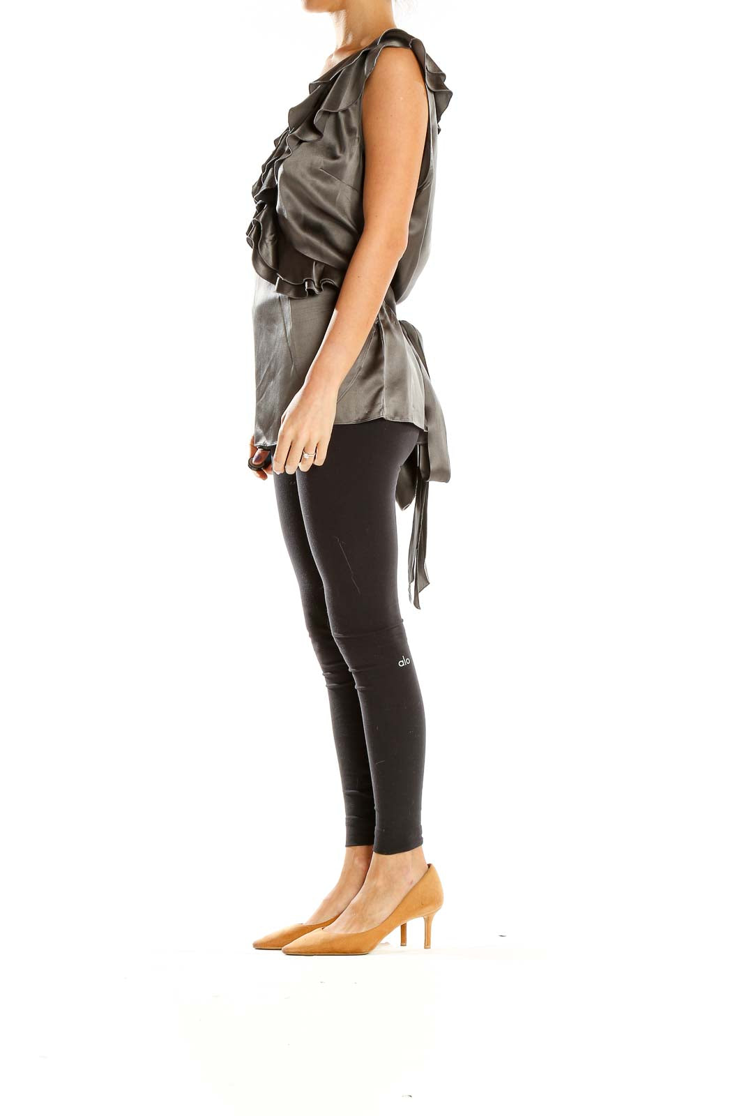 Elevate your wardrobe with this exquisite gray silk top from Saks Fifth Avenue. The luxurious silk fabric drapes beautifully, offering both comfort and elegance. The standout feature is the dramatic ruffled V-neckline, adding a touch of romance and sophistication to the piece. This sleeveless design is perfect for warm weather or layering under a blazer for a more formal look. The excellent condition of this top ensures it looks as stunning as the day it was purchased. With its versatile color and timeless design, this top can easily transition from day to night, making it a valuable addition to any fashion-forward closet. The generous cut, with a 38" bust and 32" waist, provides a flattering fit for a size XXL. At 27" in length, it offers just the right amount of coverage. Whether paired with tailored trousers for a business meeting or styled with a skirt for an evening out, this Saks Fifth Avenue top is sure to make a statement.