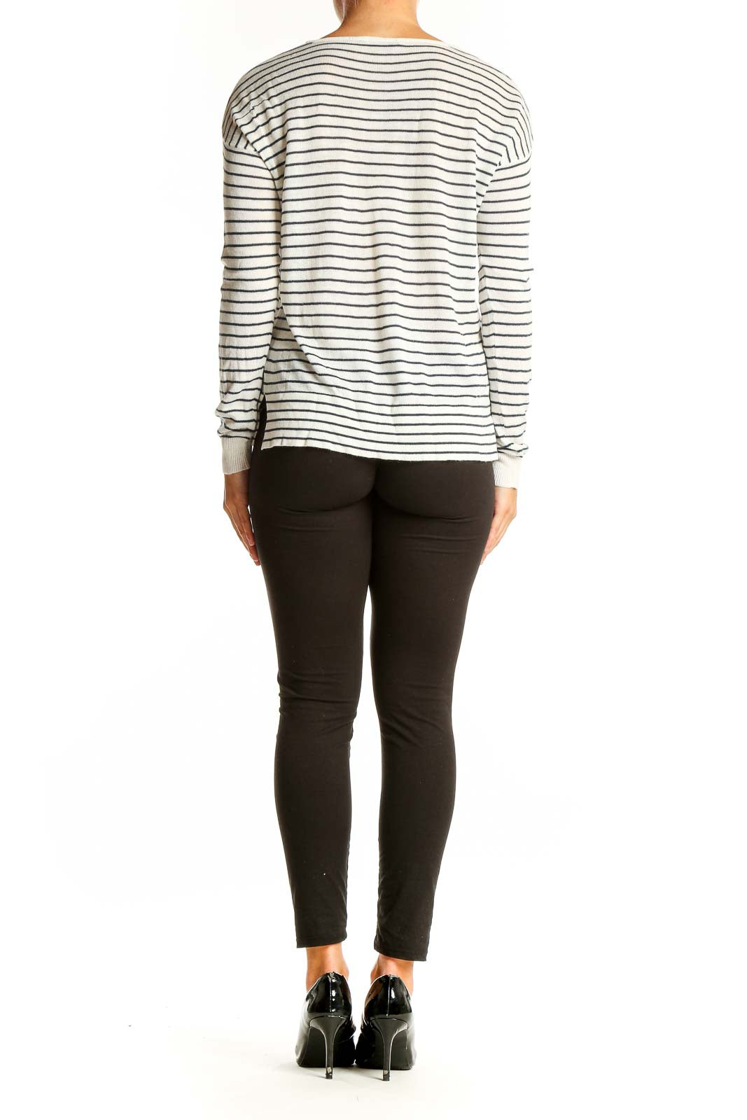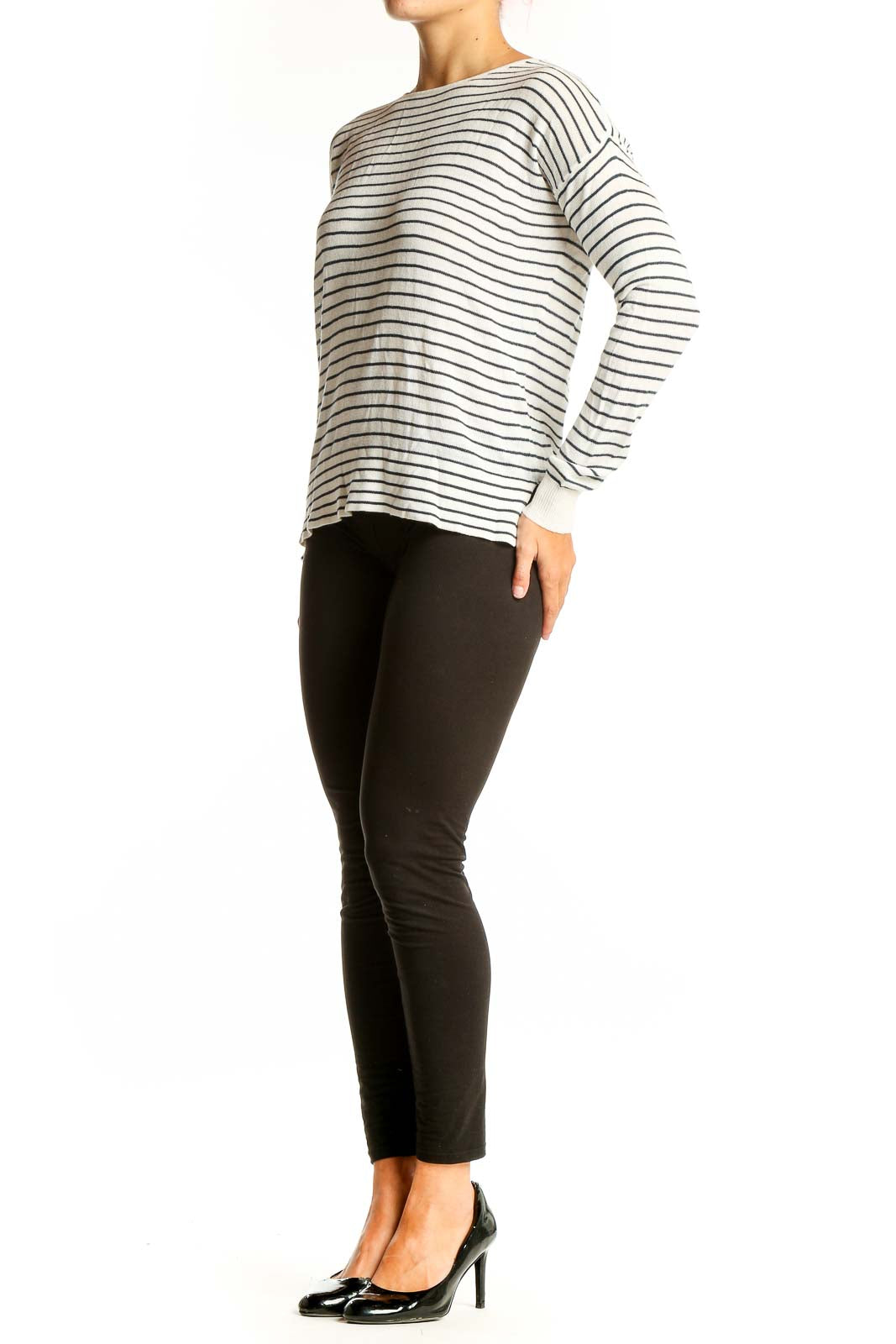 Side view of model wearing Pull & Bear White Striped Long Sleeve Knit Top with black pants