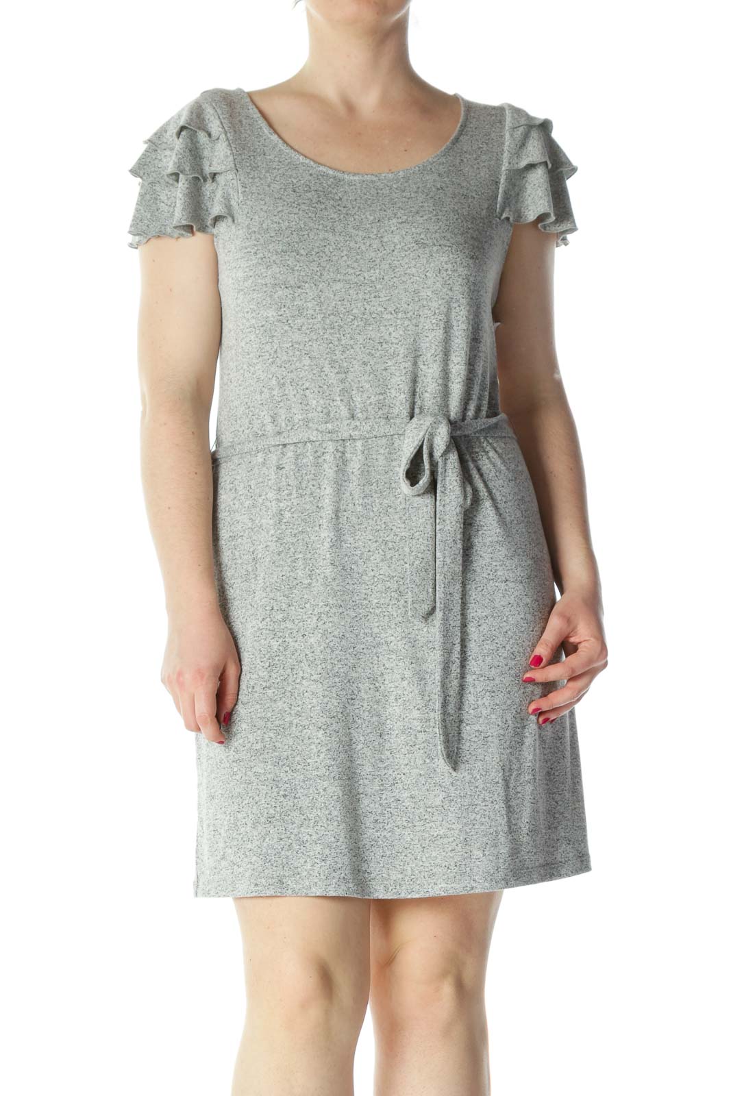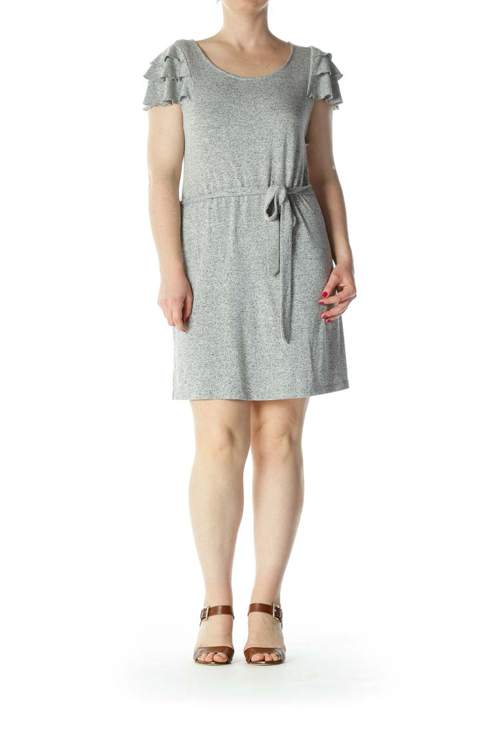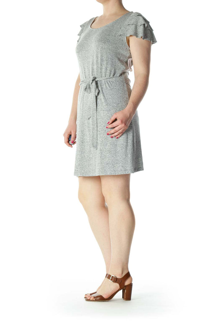 Gray Flared-Cap-Sleeves Belted Textured Dress
