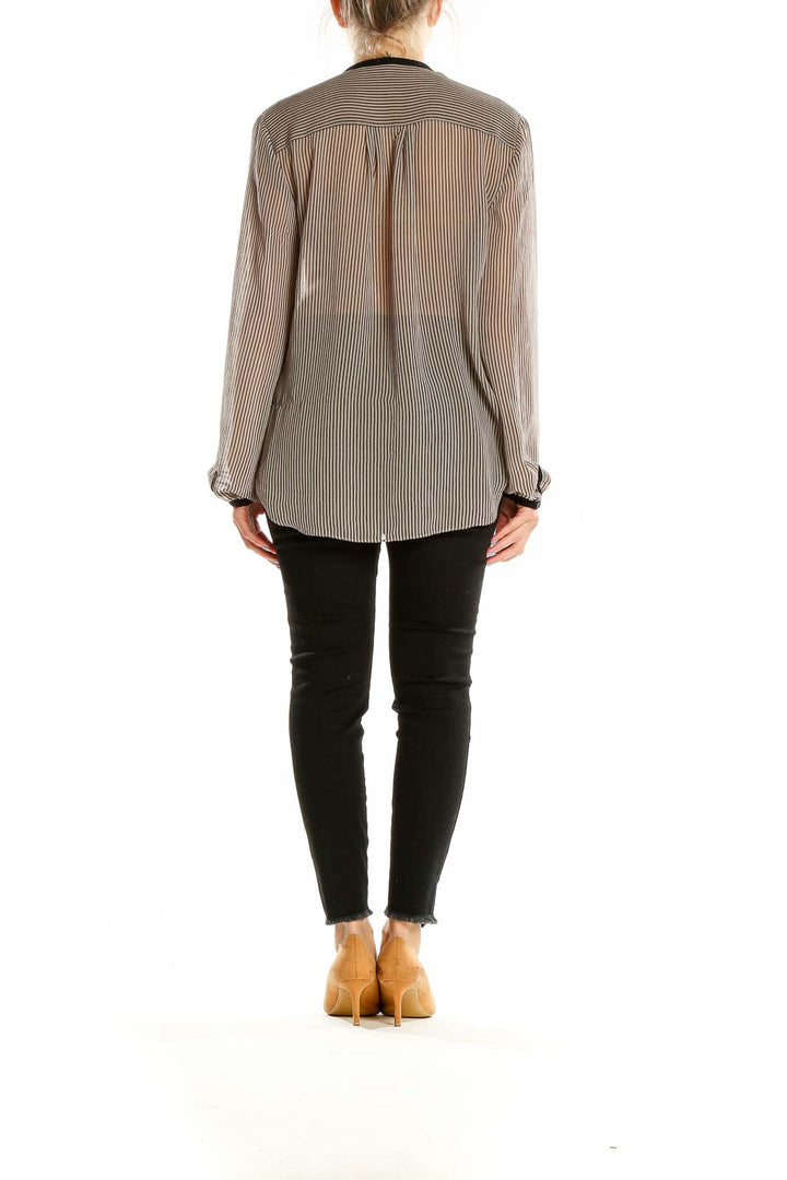 Elevate your wardrobe with this sophisticated striped blouse from RACHEL Rachel Roy. The sheer polyester fabric features a classic vertical stripe pattern in beige and white, creating a timeless and versatile piece. The blouse is designed with a striking contrast black trim along the placket and cuffs, adding a touch of modern elegance.
