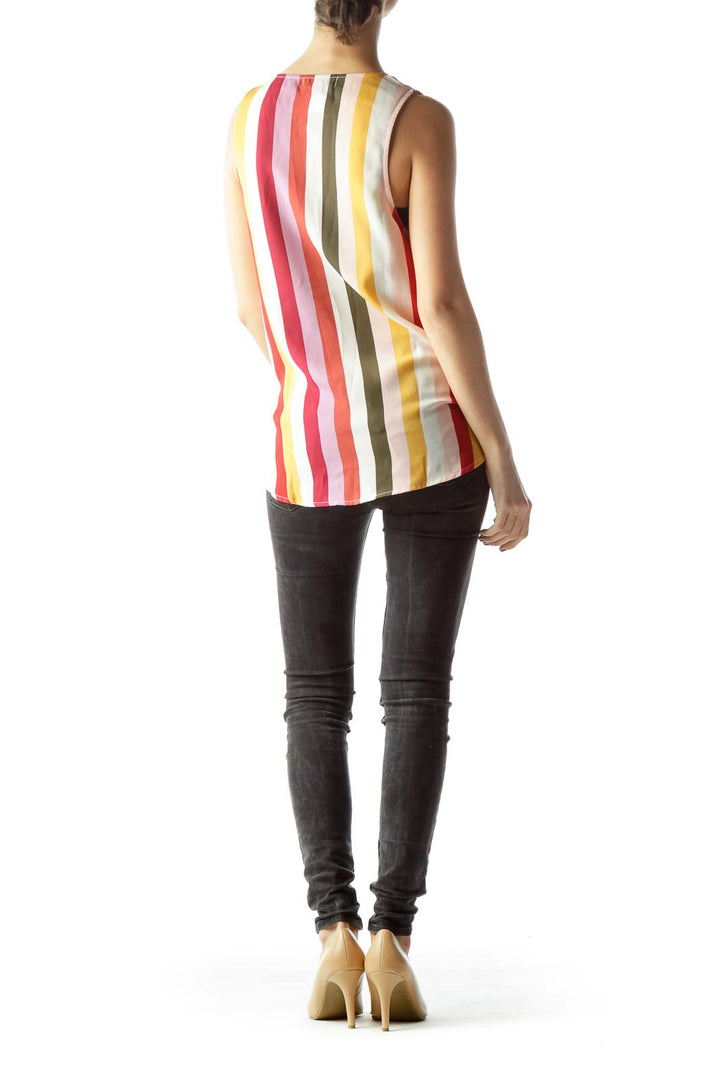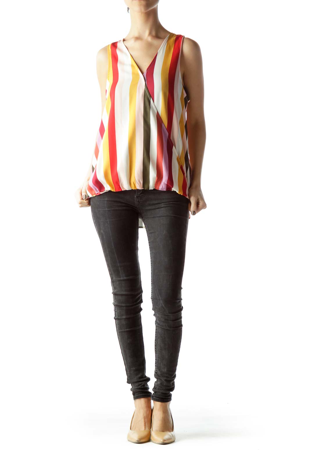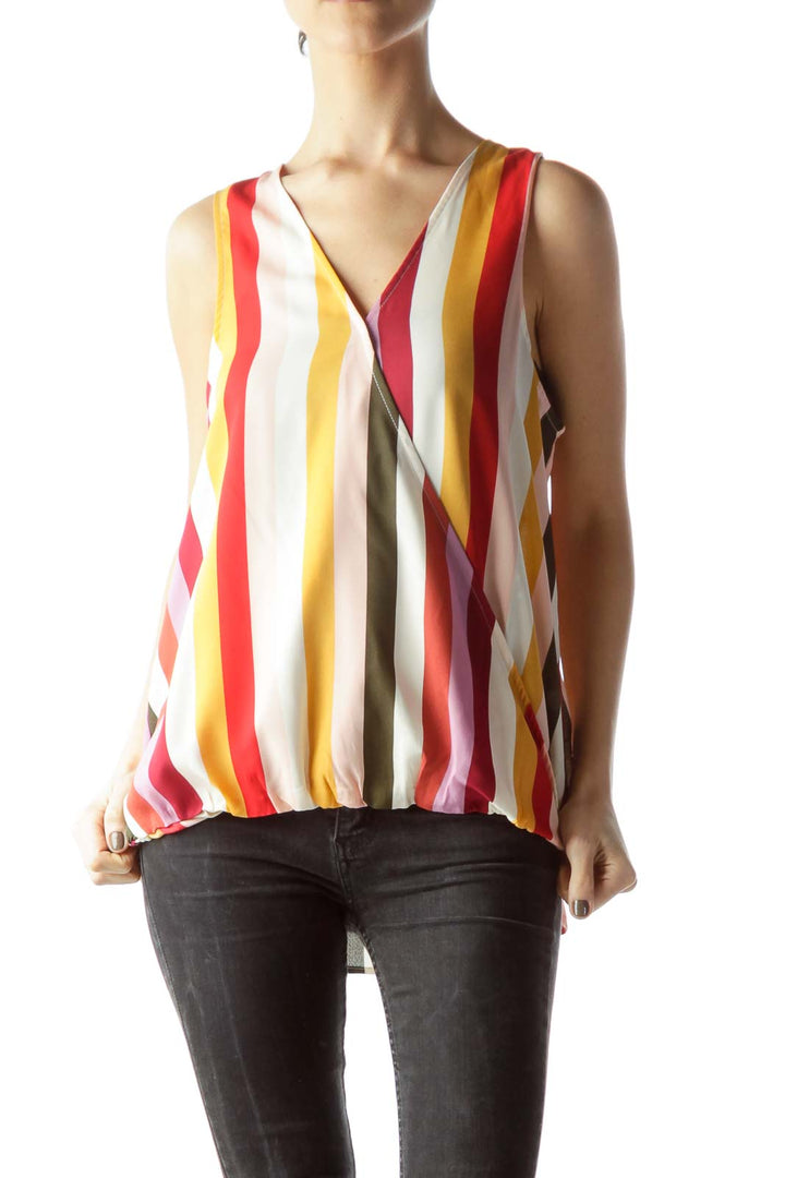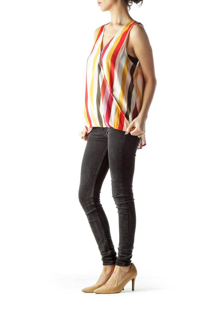 Make a bold statement with this vibrant multicolor striped sleeveless blouse from RACHEL Rachel Roy. The eye-catching vertical stripes in shades of red, yellow, white, and olive create a playful and energetic look perfect for summer days or casual outings. The sleeveless design and V-neckline offer a flattering silhouette, while the lightweight fabric ensures comfort and breathability. The wrap-style front adds a touch of sophistication, making this top versatile enough for both office wear and weekend brunches. In excellent condition, this size medium blouse features a relaxed fit with a bust measurement of 34", length of 24", and a generous waist of 38", allowing for easy movement and a comfortable drape. Elevate your wardrobe with this cheerful and stylish RACHEL Rachel Roy creation that's sure to turn heads.