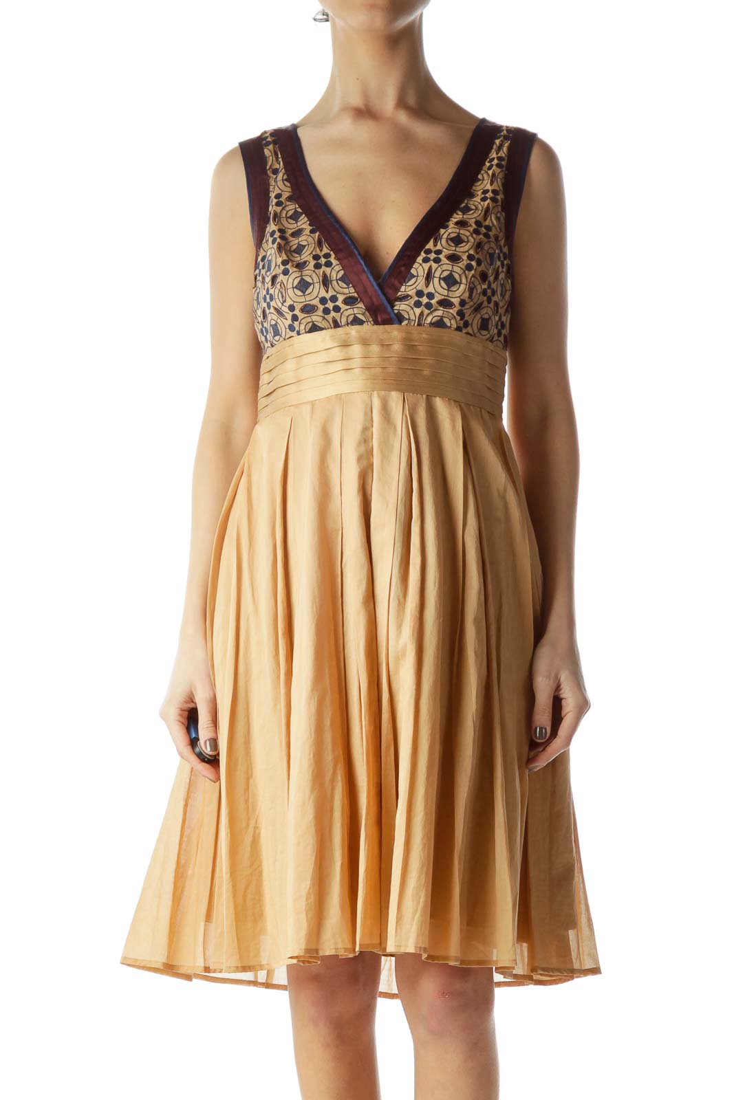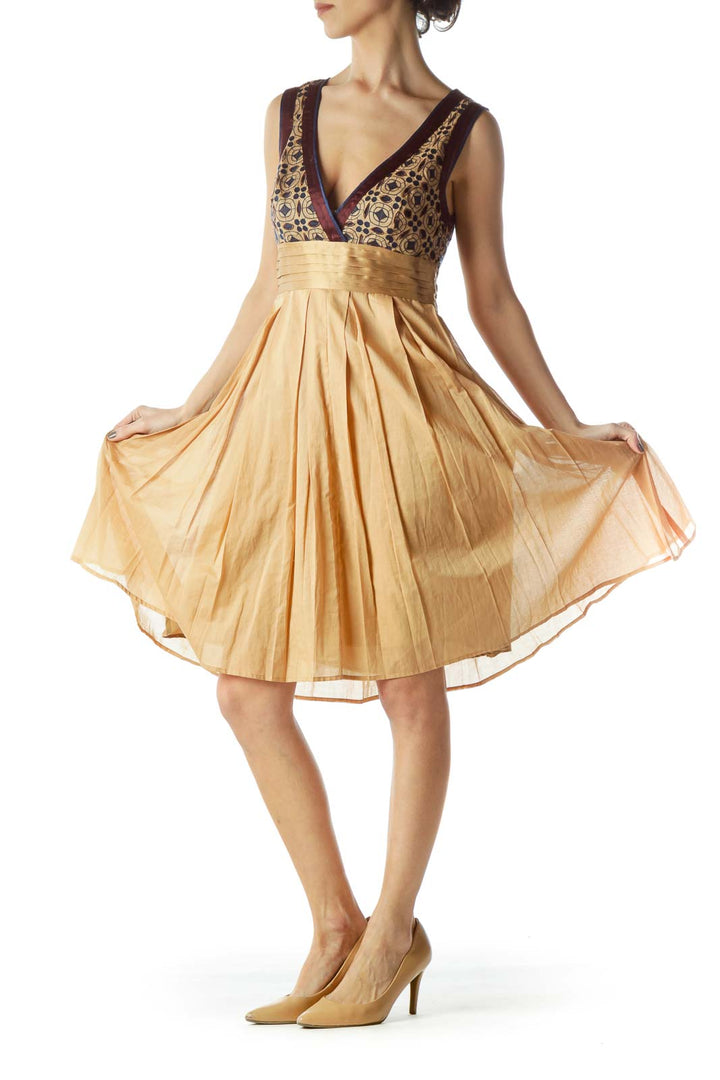 Elevate your evening attire with this stunning gold cocktail dress by Catherine Malandrino. The dress features a captivating V-neckline adorned with an intricate burgundy and gold patterned bodice, creating a luxurious and eye-catching effect. The empire waistline is accentuated by a wide, pleated gold band that flatters your figure and adds a touch of elegance.
