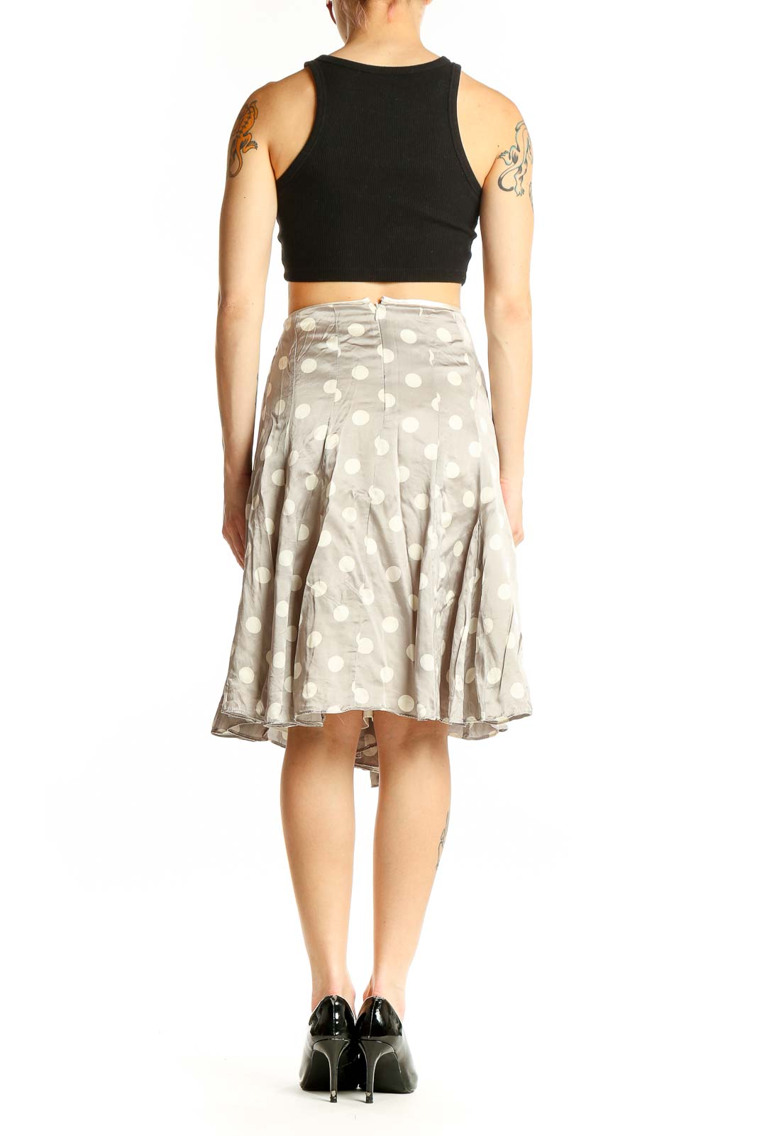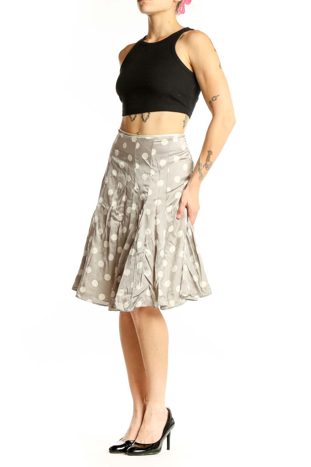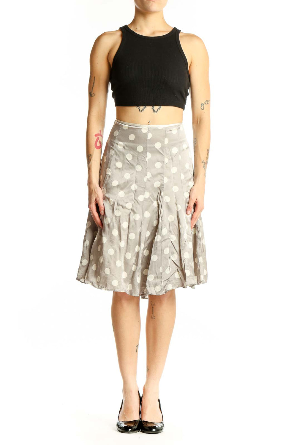 Elevate your wardrobe with this charming gray polka dot silk skirt from White House Black Market. This elegant piece features a flattering A-line silhouette that falls just below the knee, creating a graceful and feminine look. The light gray background is adorned with crisp white polka dots, adding a playful yet sophisticated touch to the design.