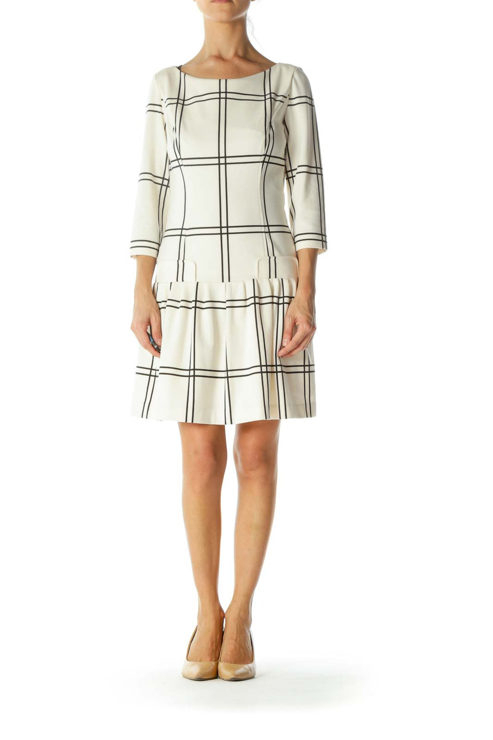 Black Cream Plaid Pleated-Skirt Long Sleeve Stretch Dress