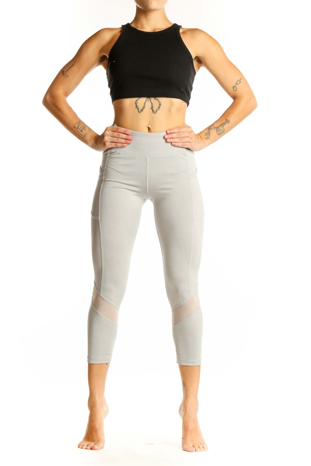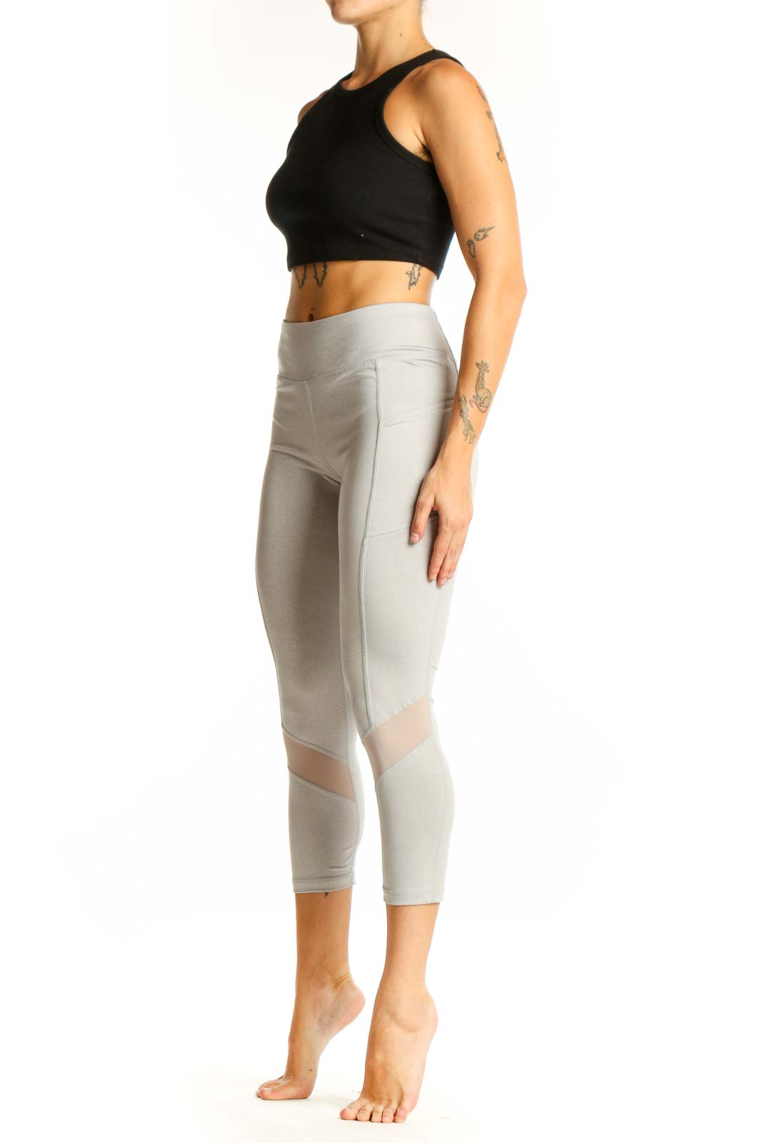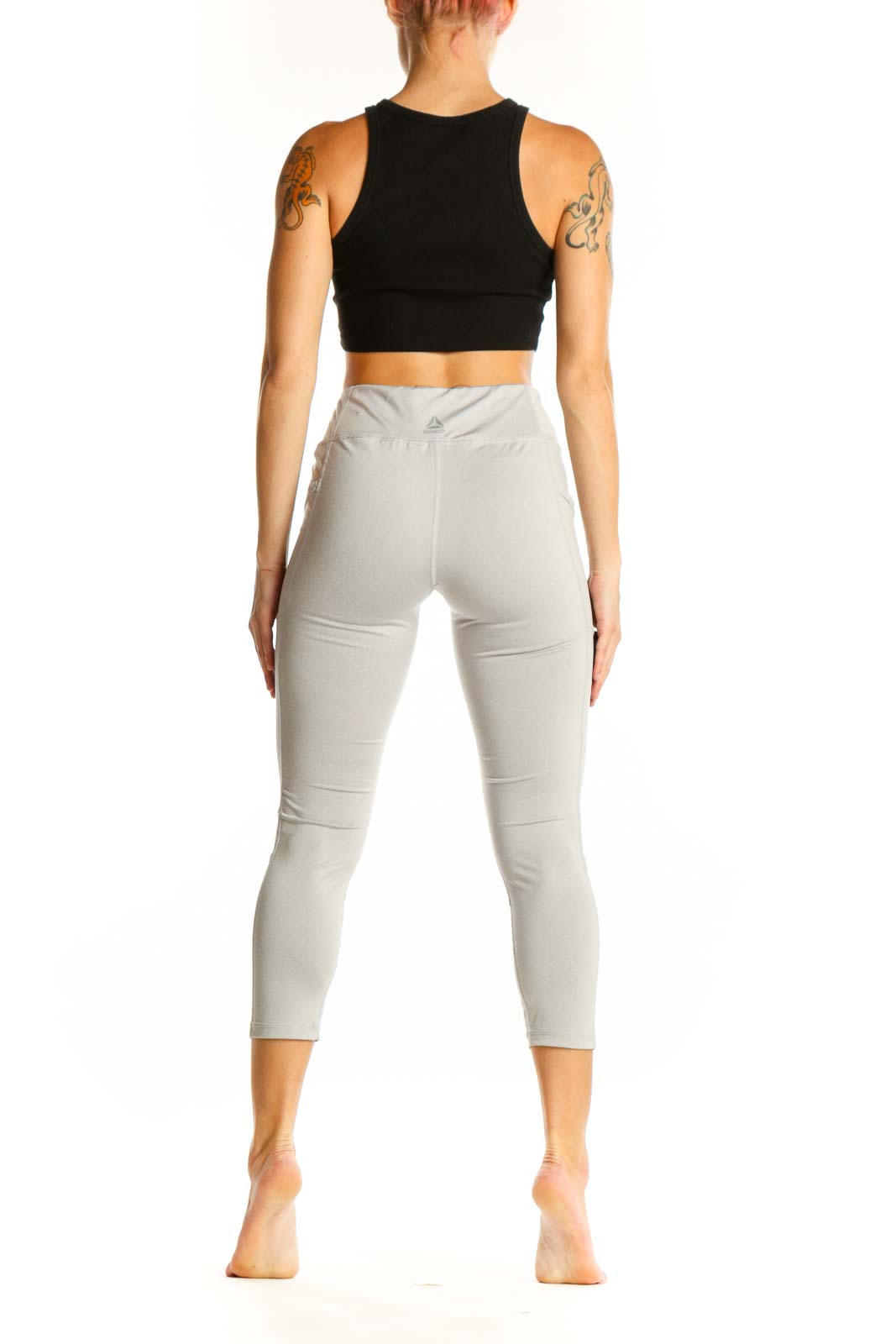 Elevate your workout wardrobe with these sleek light gray capri leggings from Reebok. Designed for both style and performance, these leggings feature a high-waisted fit that offers excellent tummy control and a flattering silhouette. The soft, stretchy fabric ensures a comfortable feel throughout your workout, while the mesh panel inserts add a touch of modern flair and enhanced breathability.