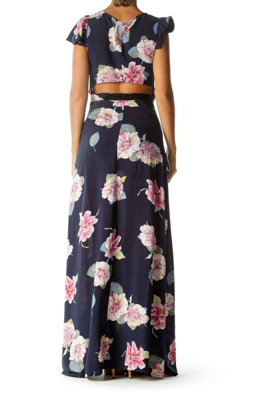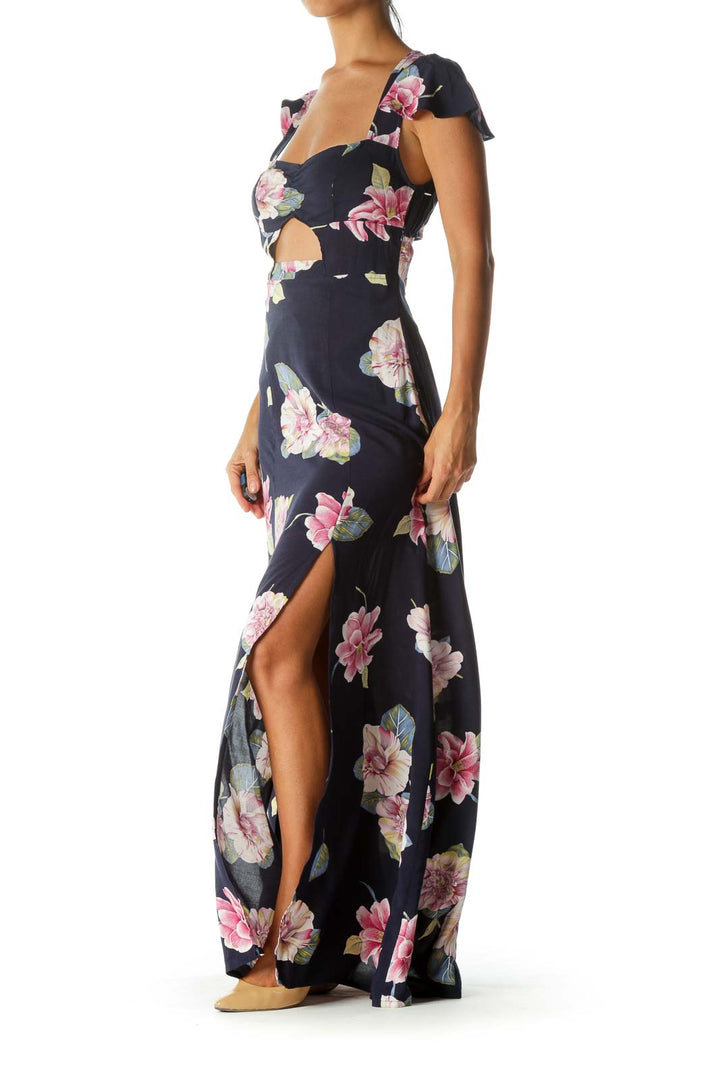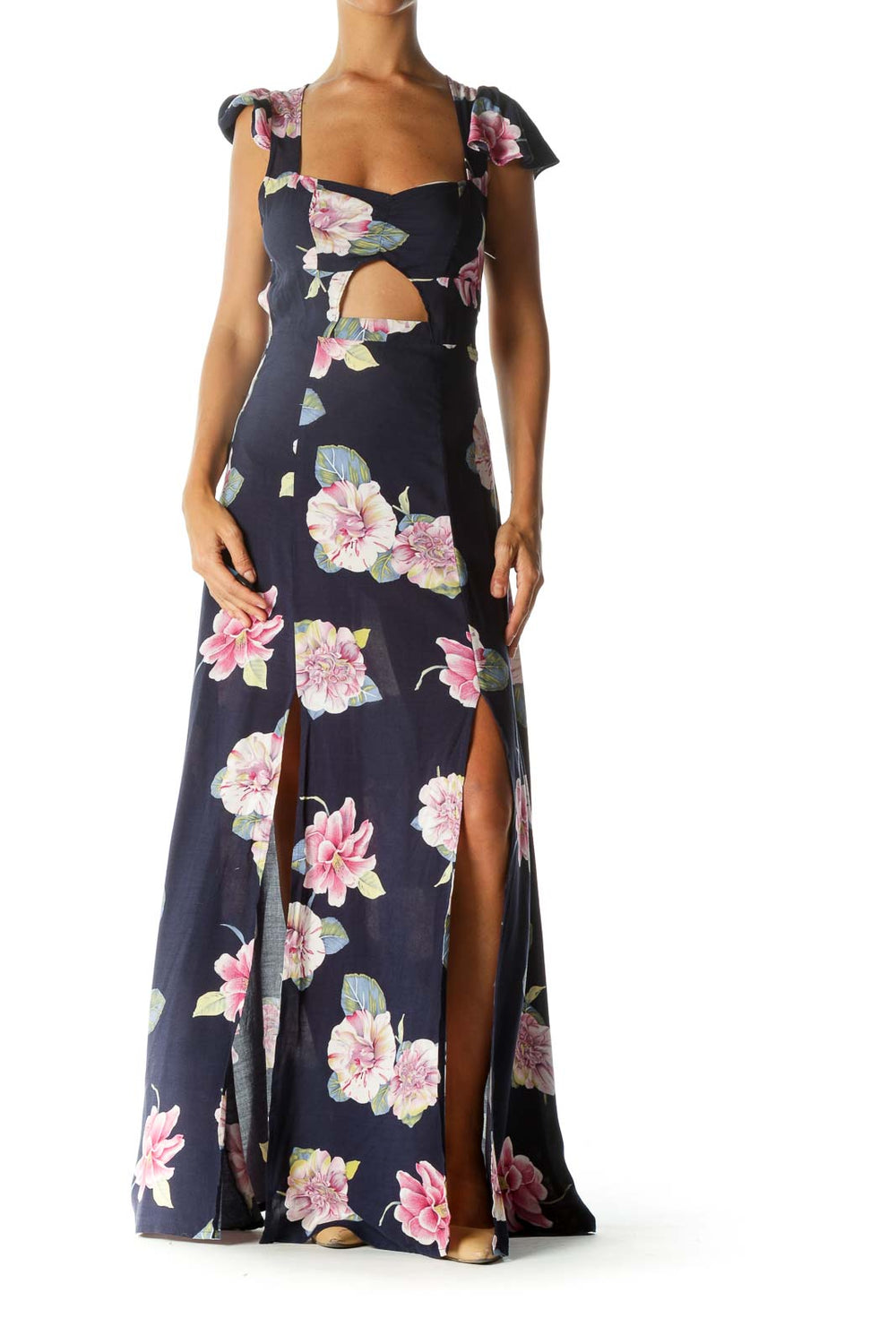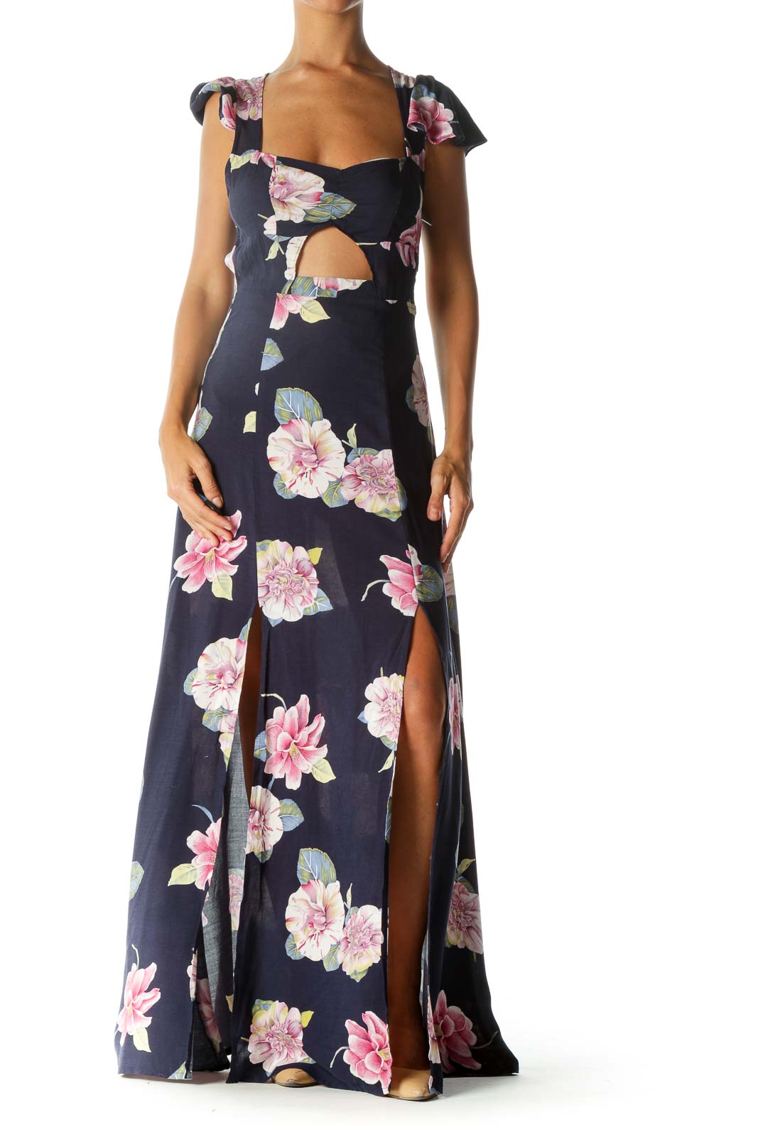 Navy Blue Pink Yellow White Floral Print Cut-Out Leg-Opening Day Dress