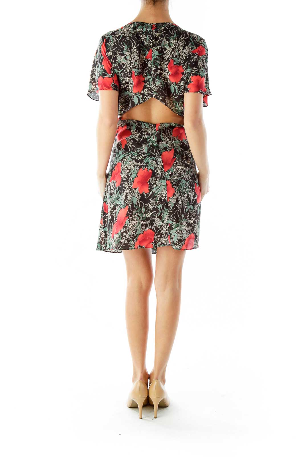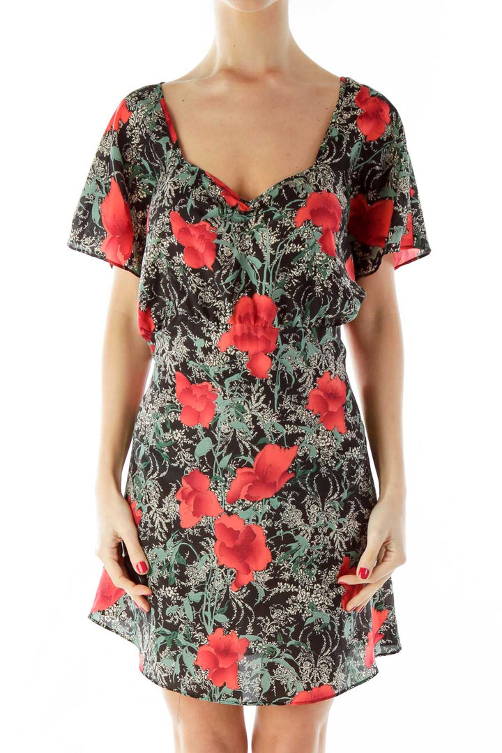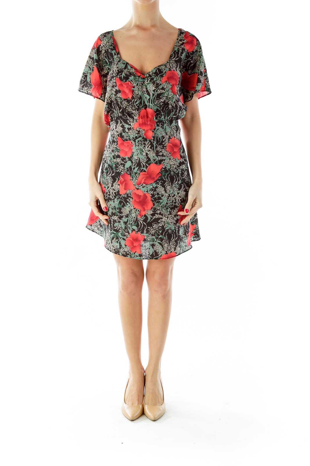 Make a statement in this eye-catching Black Floral Print Flutter Sleeve Mini Dress by Reformed. The dress features a stunning black background adorned with vibrant red poppy-like flowers and delicate green foliage, creating a bold and romantic look. The flutter sleeves add a touch of whimsy and femininity, while the V-neckline flatters your décolletage. The dress's fitted silhouette accentuates your curves, with a flared skirt that adds movement and grace. Made from lightweight polyester, this dress is perfect for warm weather occasions or layering in cooler seasons. The excellent condition ensures you'll look fresh and polished. With its eye-catching print and flattering cut, this dress is versatile enough for both day and evening wear, making it a must-have addition to your wardrobe.