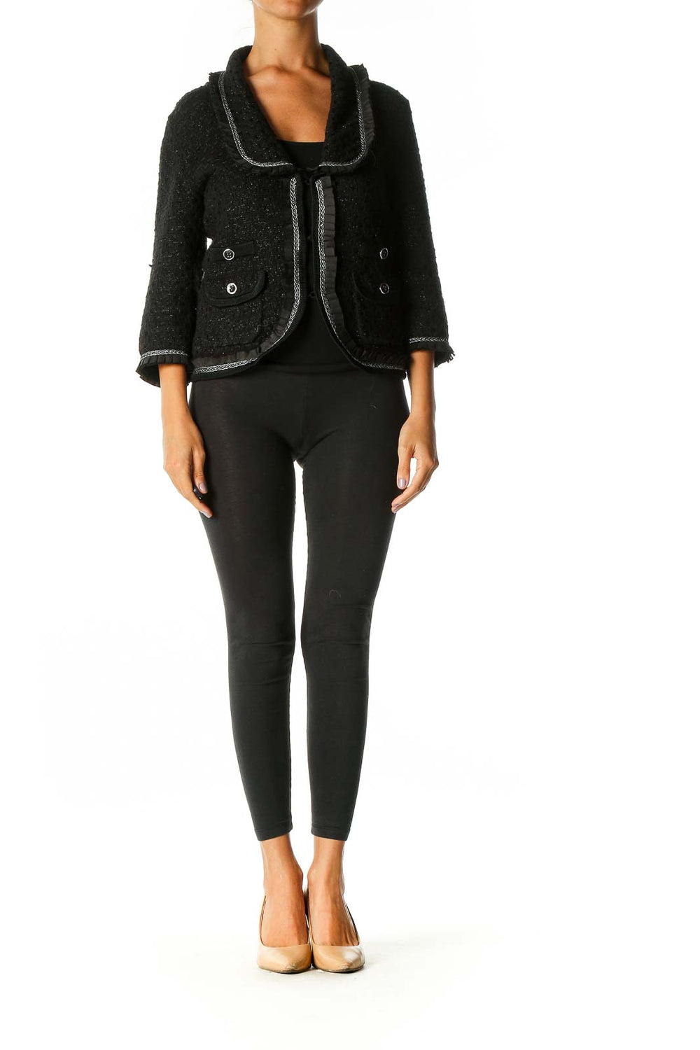 Designed with a shawl collar and 3/4 length sleeves, this jacket exudes elegance and versatility. The front is adorned with decorative buttons, adding a touch of polish to the overall look. Contrasting trim along the edges provides a refined finish, making this jacket suitable for both office wear and evening outings.