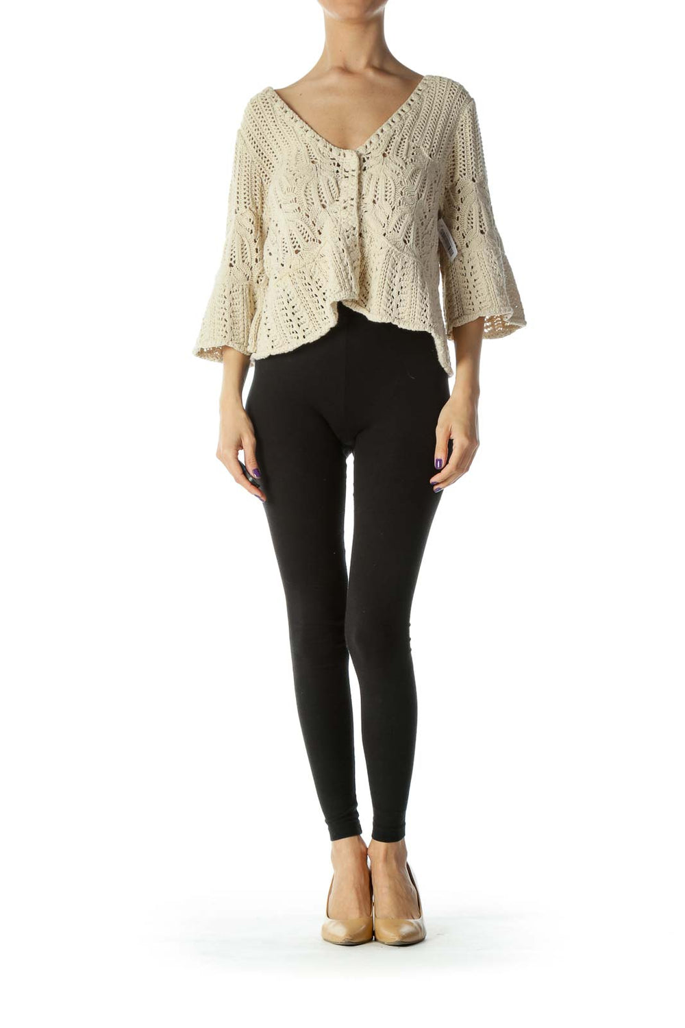 Elevate your casual wardrobe with this stunning cream crochet knit cropped cardigan from Free People. This exquisite piece features an intricate open-knit design that showcases delicate floral patterns, adding a touch of bohemian charm to your outfit. The cropped silhouette and flared 3/4 sleeves create a flattering, feminine shape that's perfect for layering over dresses or pairing with high-waisted bottoms.