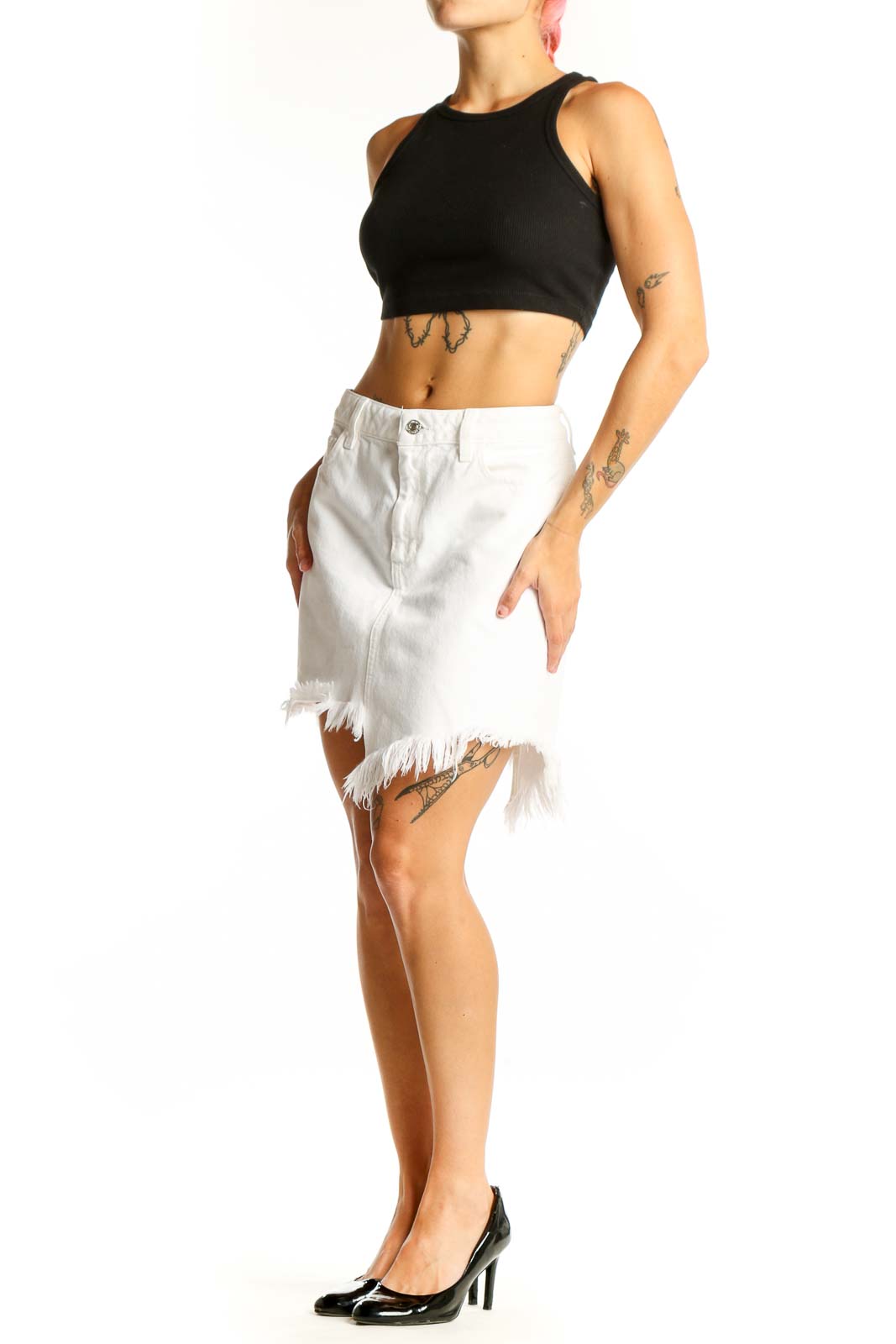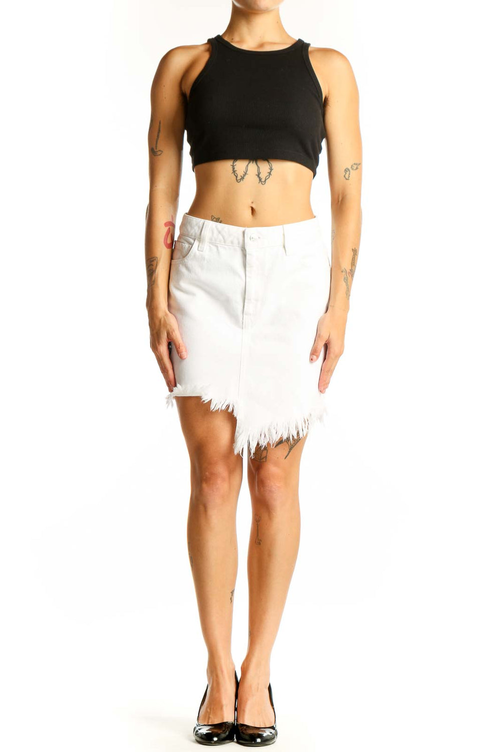 Make a statement with this edgy white denim mini skirt from Guess. Crafted from high-quality cotton, this skirt features a trendy distressed hem that adds a touch of rebellious charm to your outfit. The asymmetrical frayed edge creates a unique silhouette, perfect for those who love to stand out. With a comfortable medium size and a waist measurement of 32 inches, it's designed to flatter your figure while providing ease of movement. The excellent condition ensures you'll look fresh and stylish every time you wear it. Pair this versatile piece with a crop top for a casual day out or dress it up with a blouse for a night on the town. The 15-inch length hits just right, making it an ideal choice for showing off your legs. Embrace the classic appeal of Guess denim with a modern twist in this must-have skirt.
