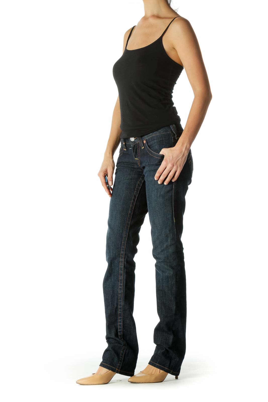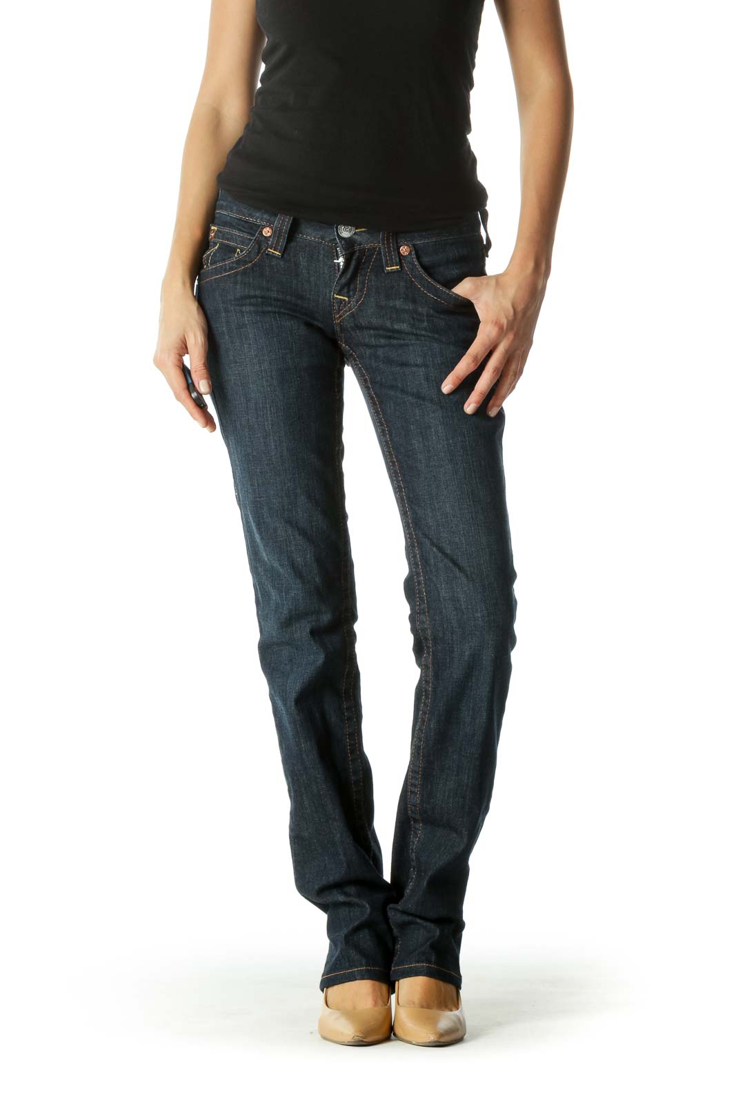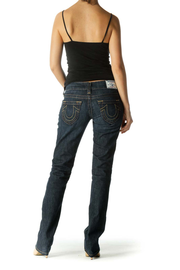 Blue Dark-Wash Pocketed Straight Leg Denim Jeans