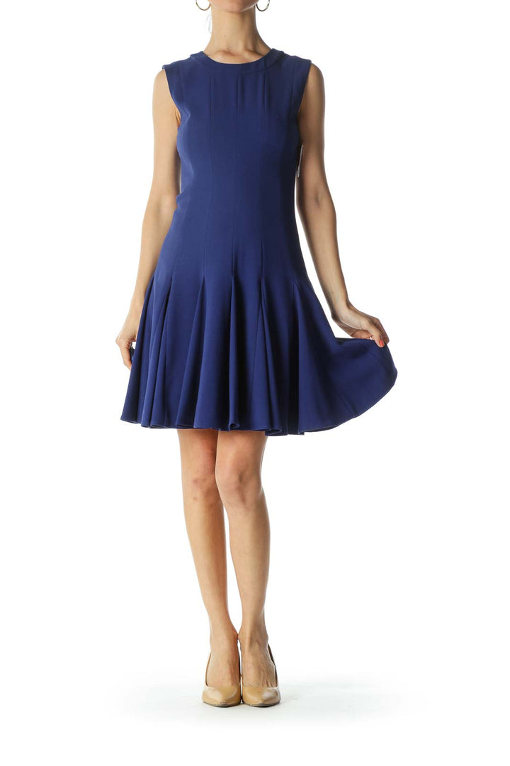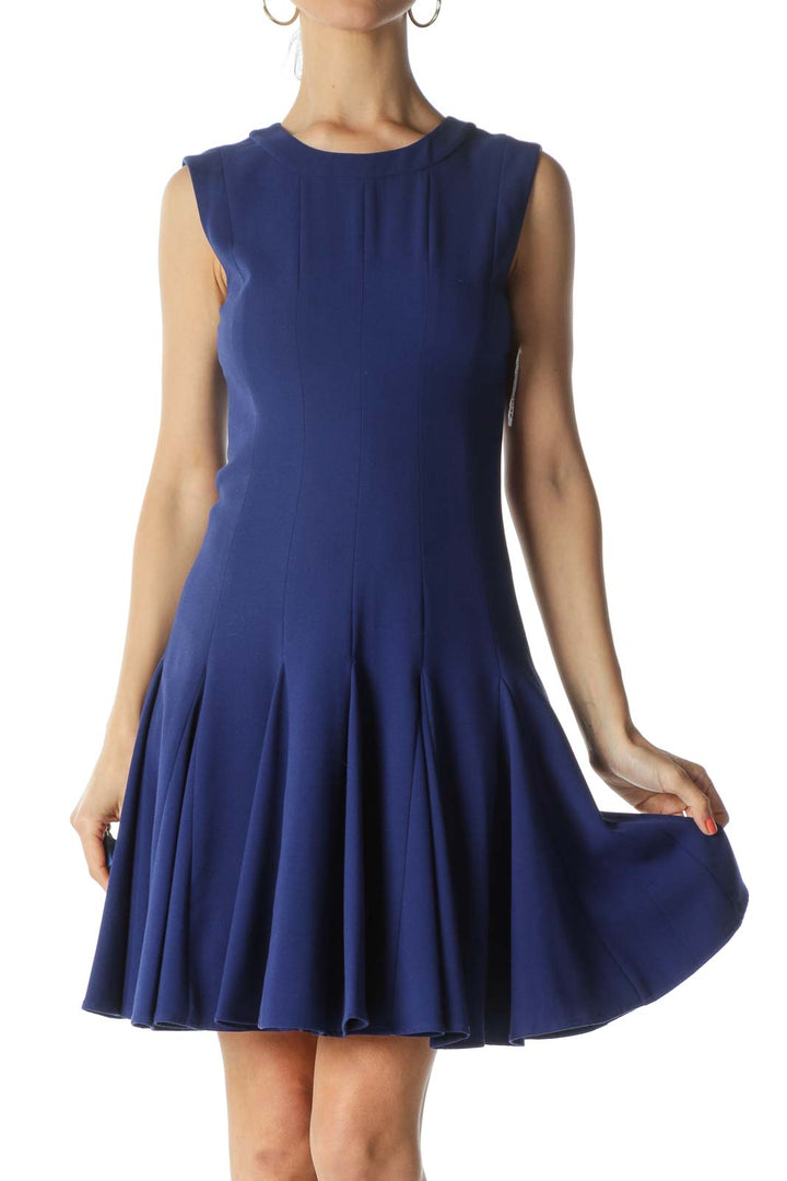 Blue Round-Neck Sleeveless Pleated-Bottom Work Dress